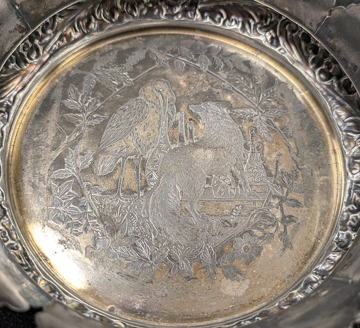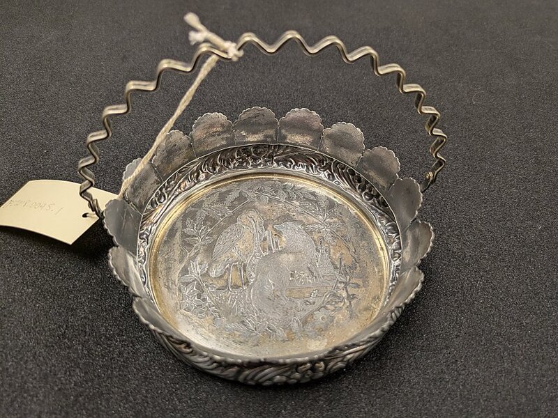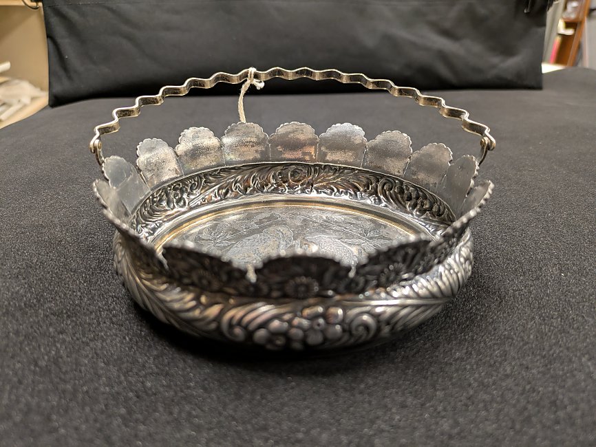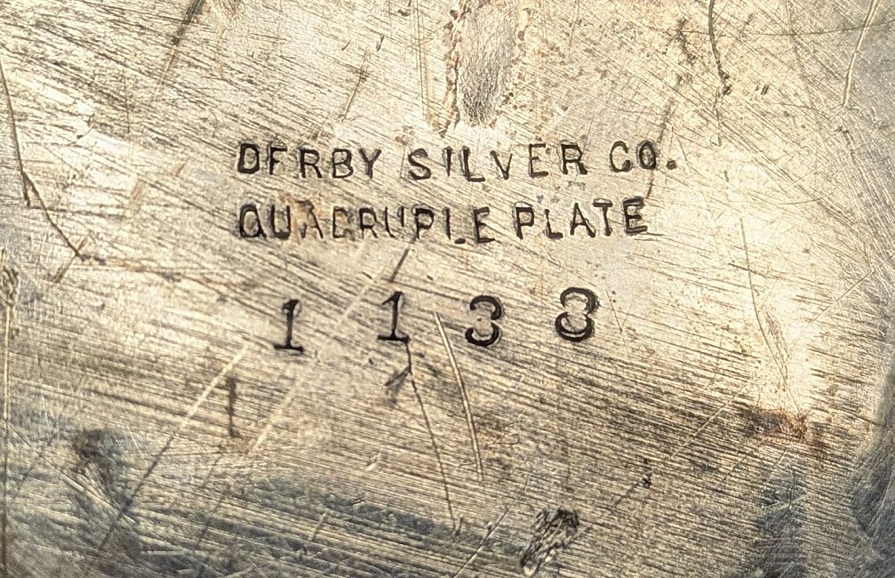 1950? Victorian Derby Silver Basket with FS Internal Image. Derby Silver Company Quadruple Plate. 1138? 6" in diameter; basket is 1.75" high. Unknown source.