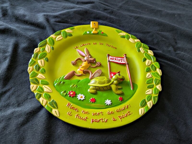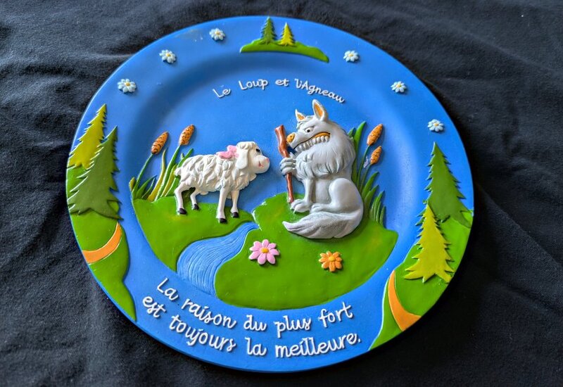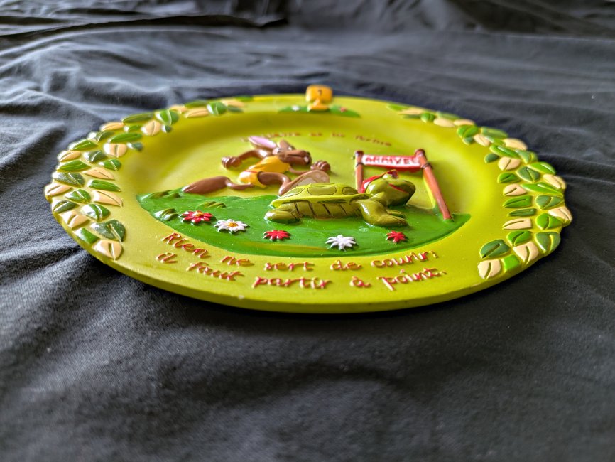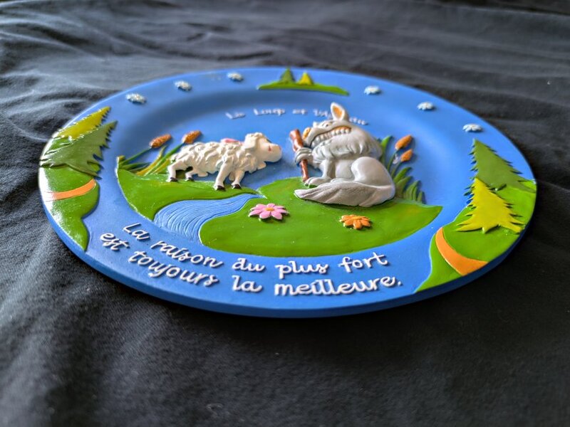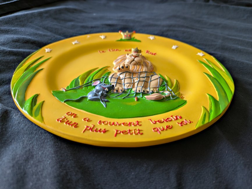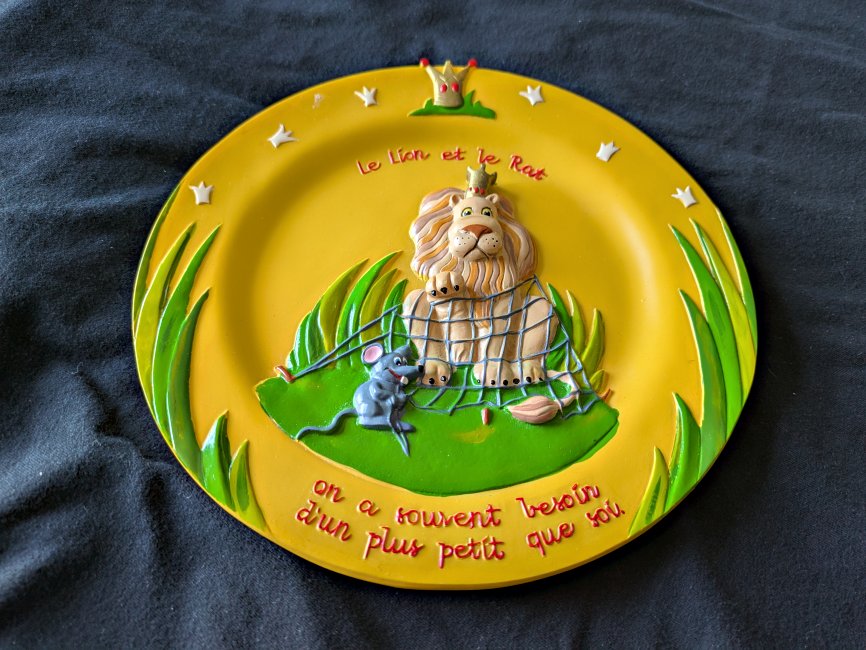 Deep relief scene of the fable, with floral patterns at the sides and a moral below. There is a hook for hanging implanted in the resin back. - Date