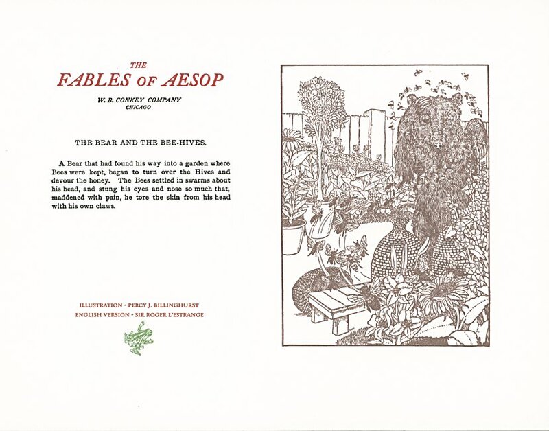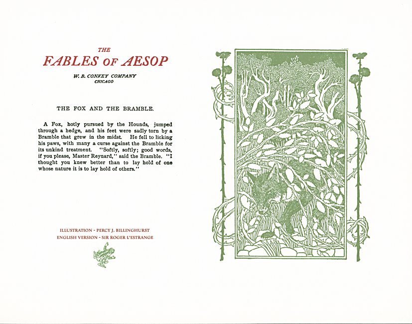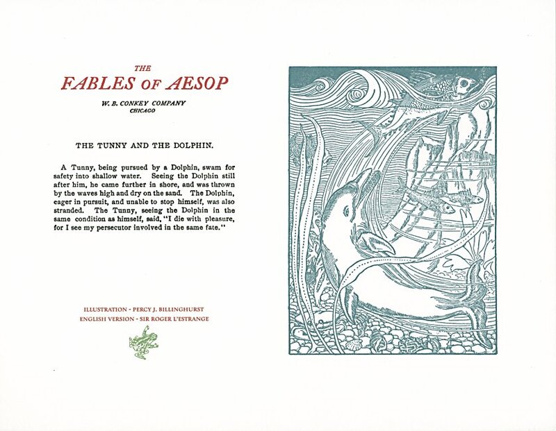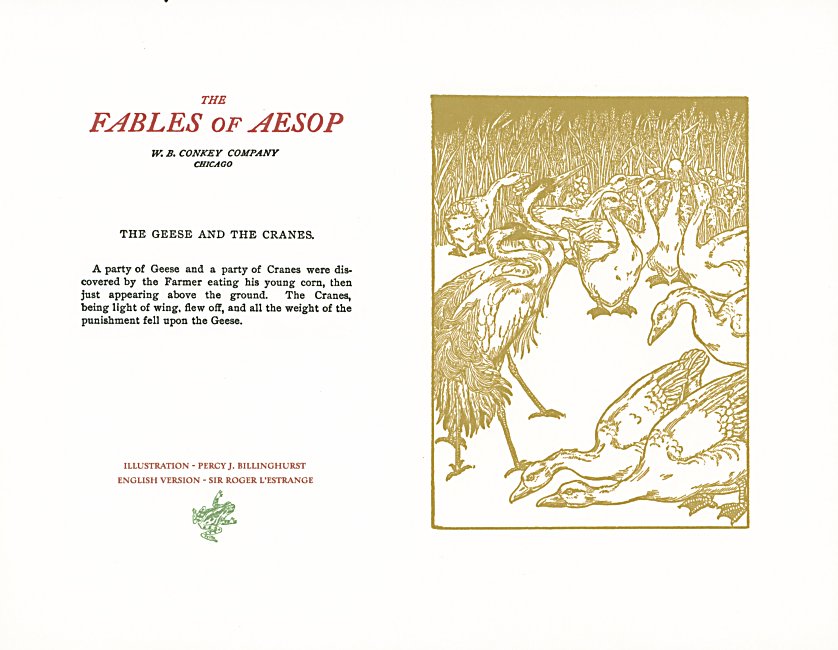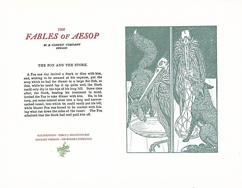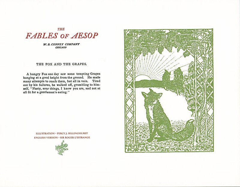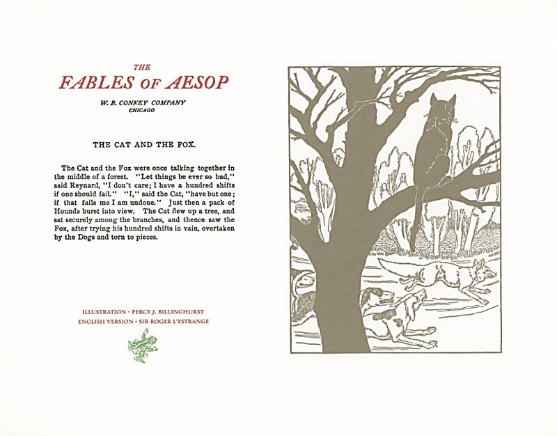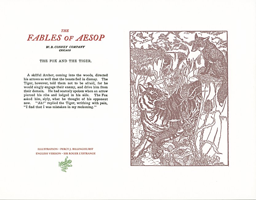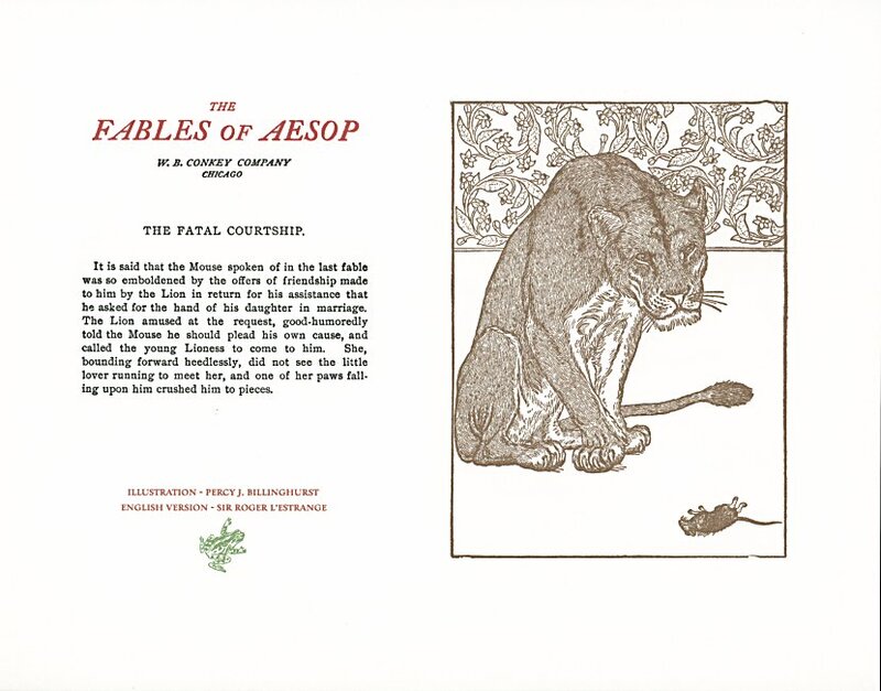 These are attractive broadsides, nicely printed. Strong work with various colored inks. There are two striking anomalies. One is that the standard J.B. Rundell texts used regularly in Conkey editions of Aesop are used here but labeled as coming from "L'Estrange." The other anomaly was already present in the early Conkey editions: Billnghurst did these illustrations for La Fontaine's fables. - Date