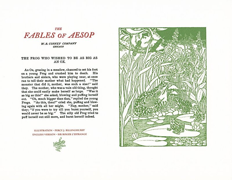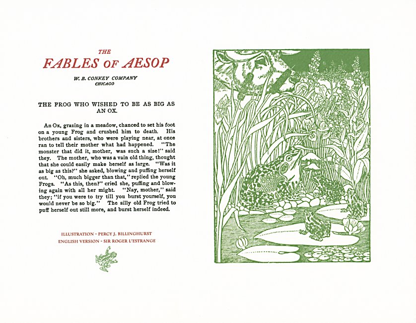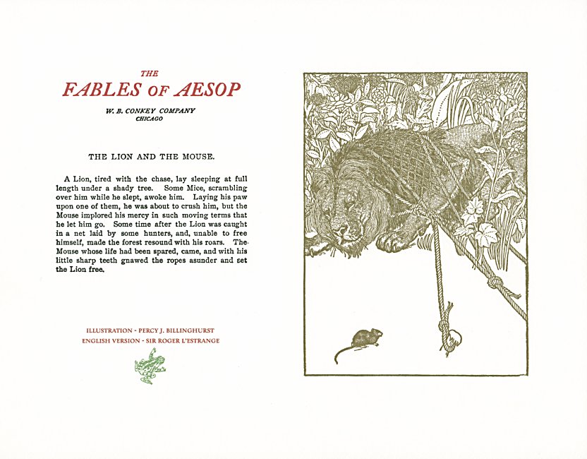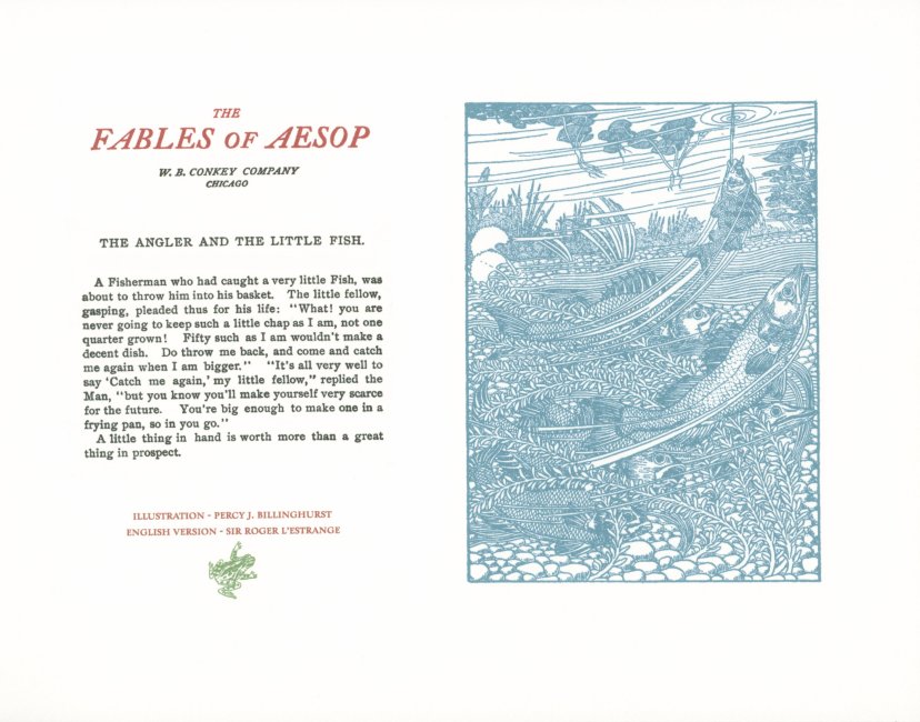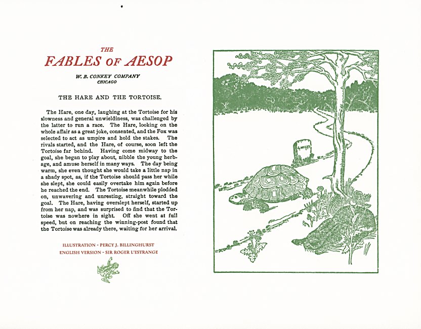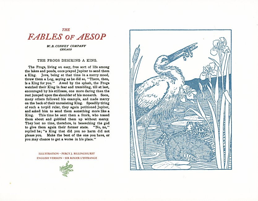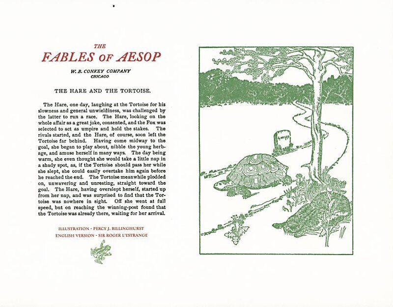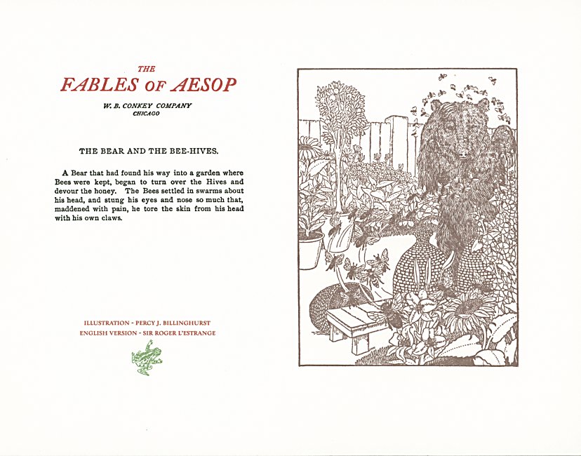 These are attractive broadsides, nicely printed. Strong work with various colored inks. There are two striking anomalies. One is that the standard J.B. Rundell texts used regularly in Conkey editions of Aesop are used here but labeled as coming from "L'Estrange." The other anomaly was already present in the early Conkey editions: Billnghurst did these illustrations for La Fontaine's fables. - Date