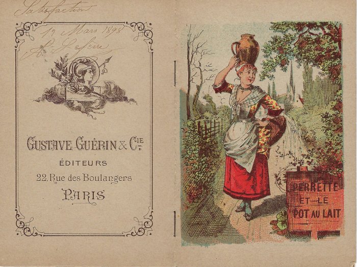 1898 Pamphlet printed by Gustave Guérin & Cie, Paris, offering La Fontaine's text of MM along with three chromolithographs of the fable. $20 from Bertrand Cocq, Calonne Ricouart, August, '20.