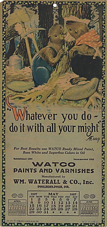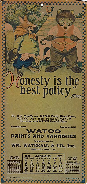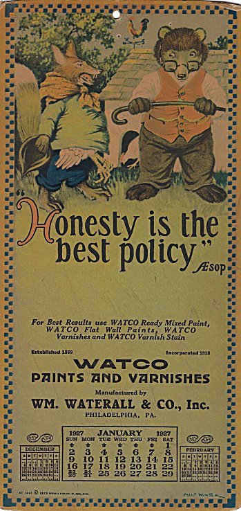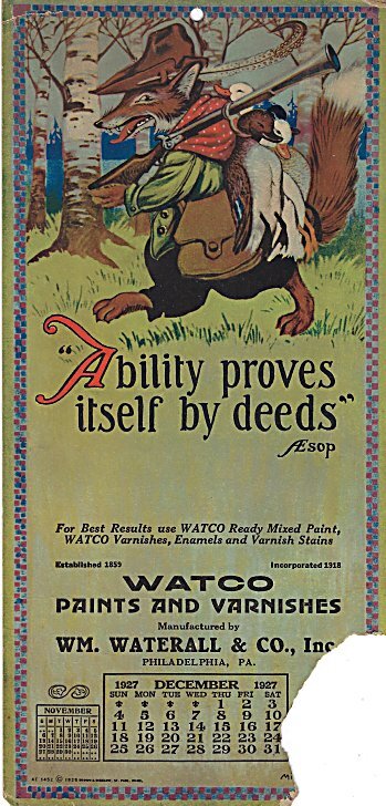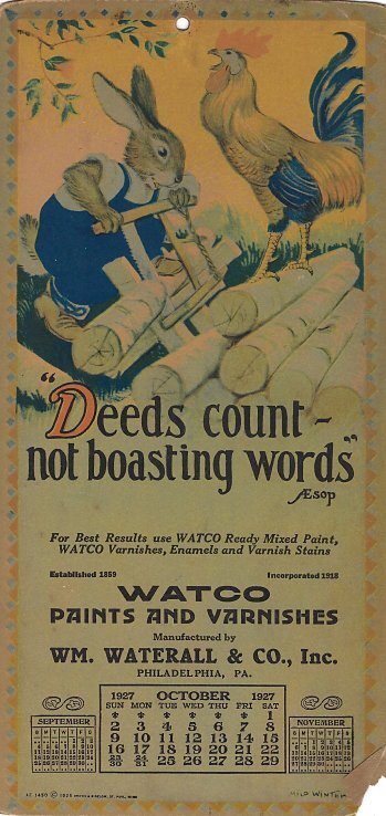 1926-27 Watco Paints and Varnishes. Five calendars from November, 1926 through December 1927 quoting Aesop. Designed by Milo Winter. $60 from snydersjunkyard, Pennsburg, PA, through Ebay, Dec., ’24.