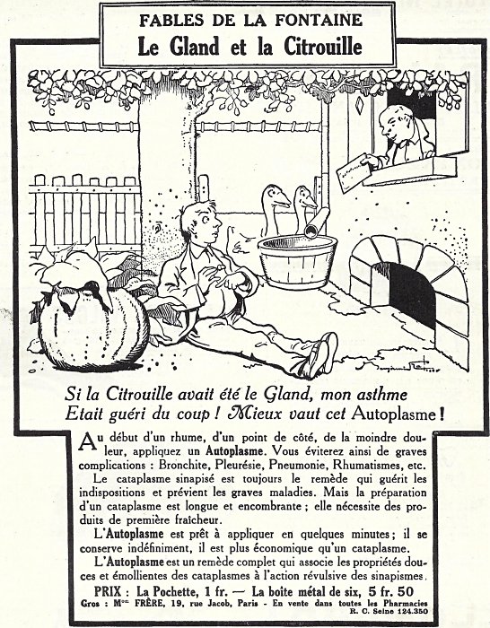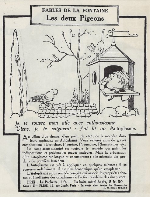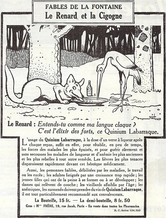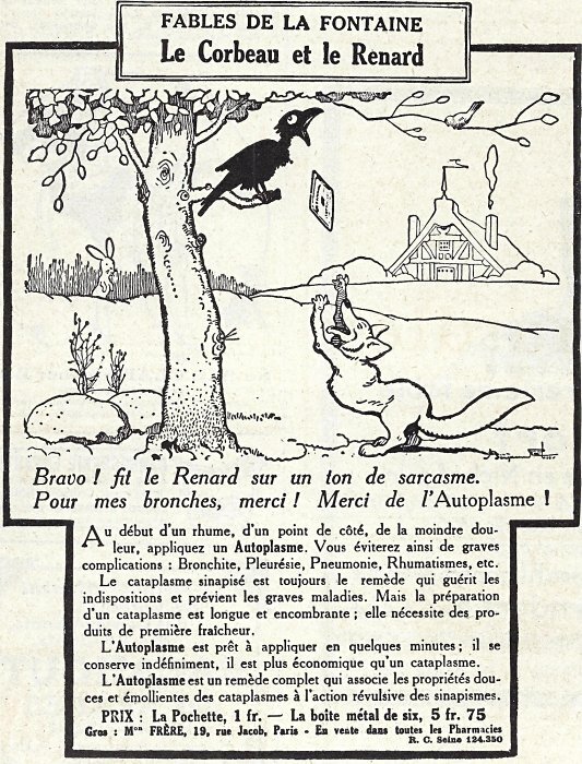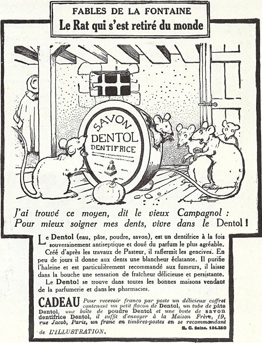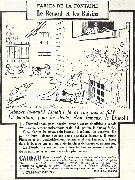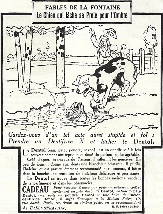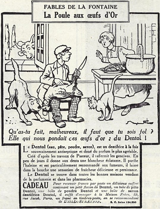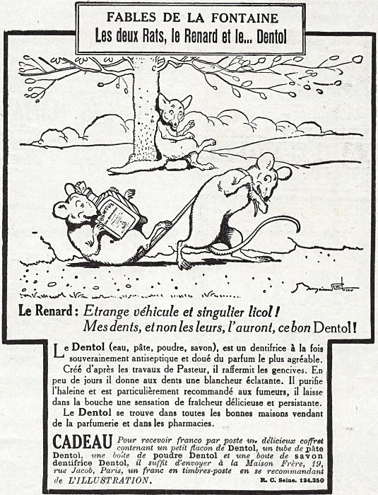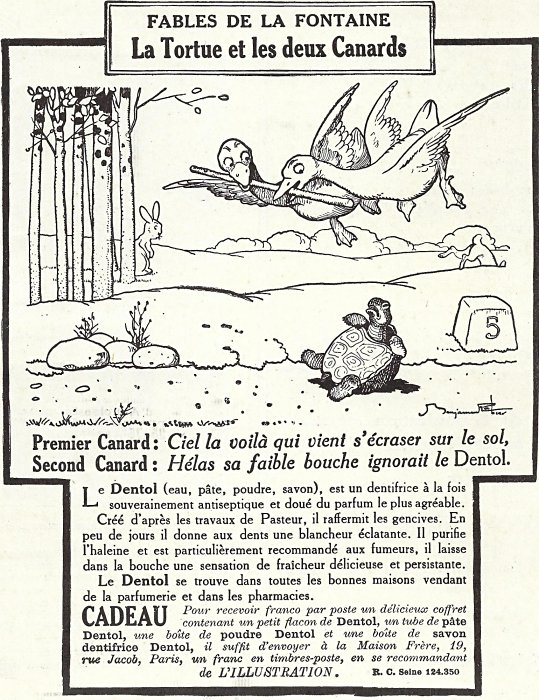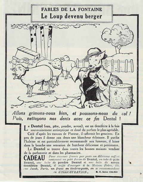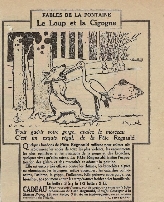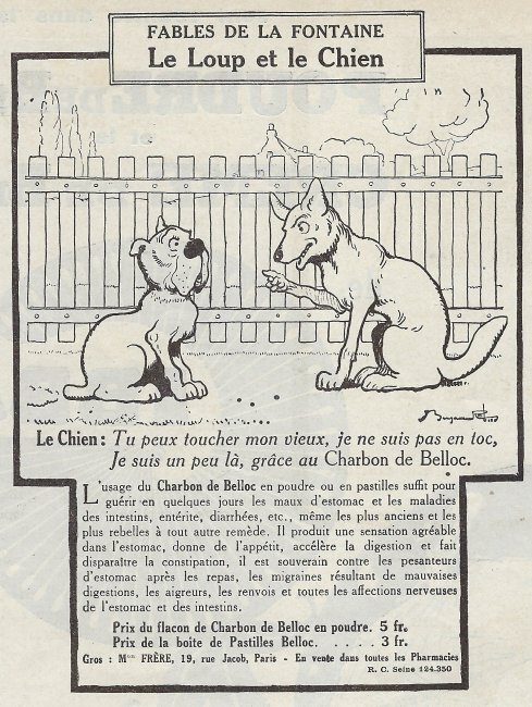 1924 Twenty-three advertisements (and three duplicates) for various products using the artistry of Benjamin Rabier. All printed sometime in 1924 in L'Illustration. Products include Dentol, Regnauld Cream, and Goudron Guyot. €53 from Champy50 on Ebay, June, '20. GA for €8 and "Cobbler and Financier" for €6.50 from authenticpubs on Ebay, Sept., '21. "Wolf Become Shepherd" for €3 from art.deco.ads on Ebay, Oct., '21. Three further advertisements for €3 each from anciendocument through Ebay, Oct., '21. Three further advertisements from AuthenticPubs through Ebay.fr, Oct., '21.