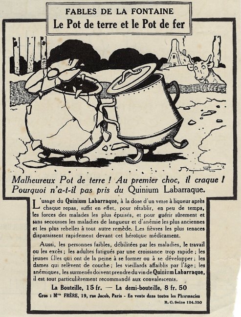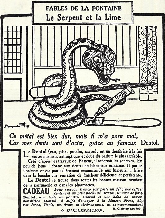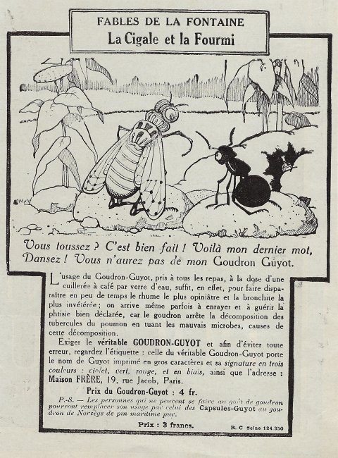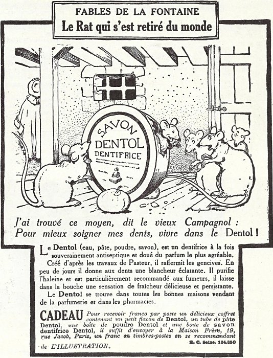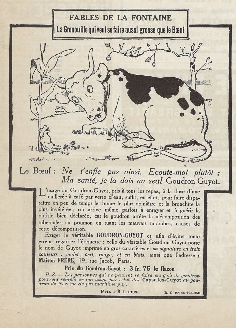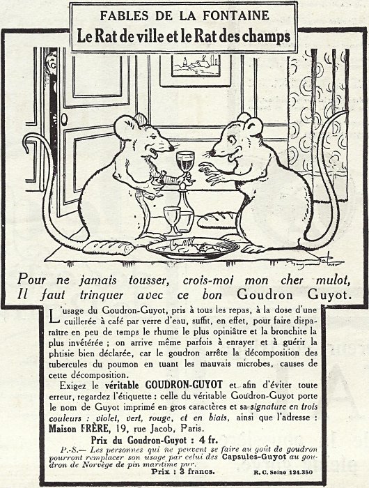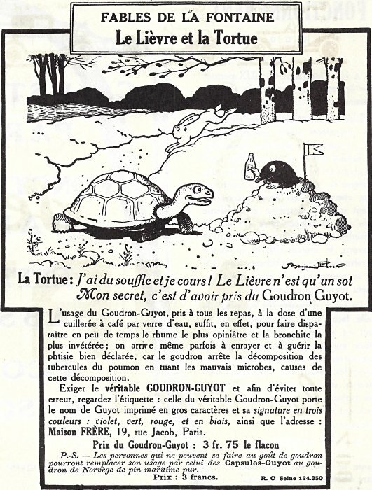 What is so lovely about these advertisements is that each uses the well-known fable situation to work in a claim for the advertised product. So the "talkative turtle" could not sustain his flight holding on to the stick carried by the two ducks because he did not use Dentol to make his teeth strong. The tortoise was besting the hare because he took Goudron Guyot. The rat who retired from the world secure himself inside not a big wheel of cheese but a wheel of Dentol. The lamb that is normally eaten by the wolf offers him instead a some paste for his cough. Enjoy the twist of the fable in each case and click on the saying or picture to see a bigger rendition.