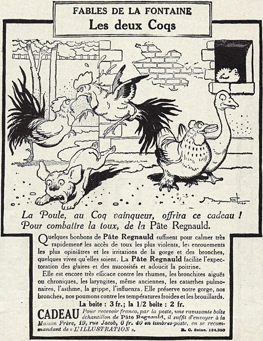 Two Cocks: The hen will offer the winner this gift: to fight a cough, some Regnauld Cream.