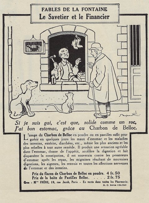 Cobbler and Financier: "If I seem cheerful, it's because as solid as a rock, I have a good stomach, thanks to Charbon de Belloc."