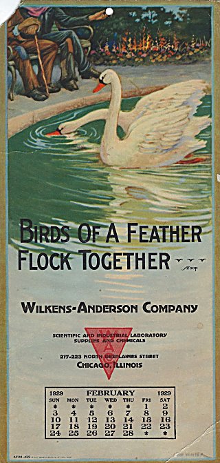 1928? February, 1929 calendar with a maxim from Aesop and a Milo Winter illustration. Advertisement for Wilkens-Anderson Company, Chicago, IL. 4¾" x 10". St. Paul, MN, and Sault Ste. Marie, Ontario: Brown & Bigelow. $7 from Sandyscottage through Ebay, Jan., '25.