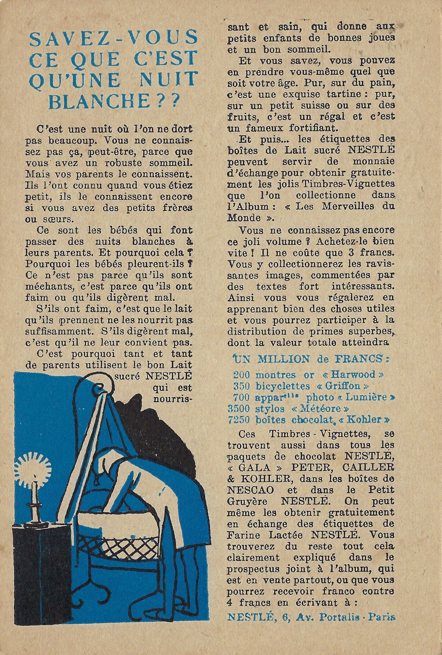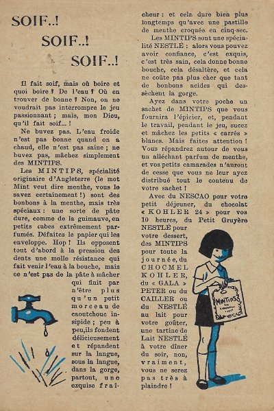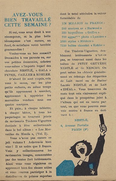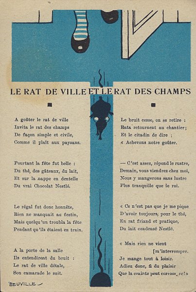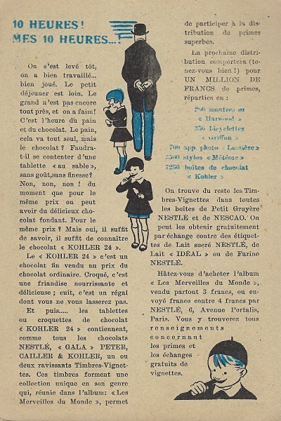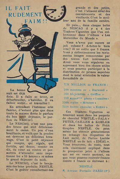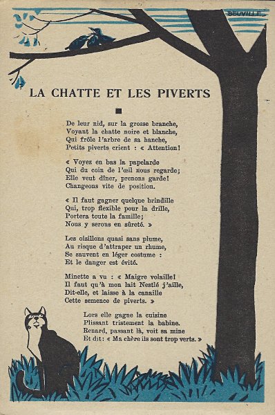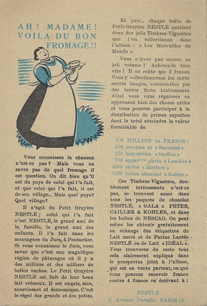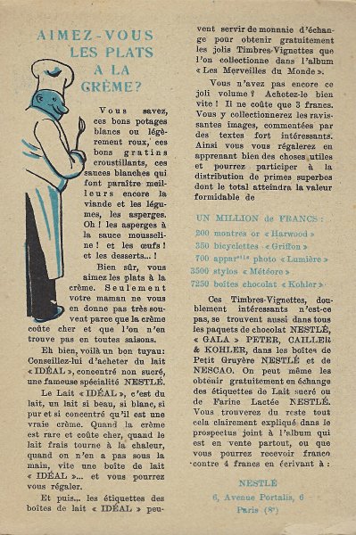 1930? Seven Nestlé advertising cards. Text and illustration on the front side of each card in duochrome black and blue. The verso of each, in black and one other color, has questions, suggestions, and a mention of Nestlé. $42 from Bertrand Cocq, Calonne Ricquart, France, Sept., '18. Four further cards for £1 each from 18otmus through Ebay, August, '21.