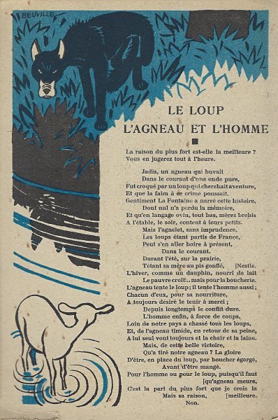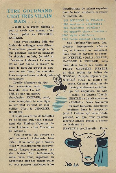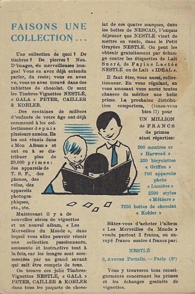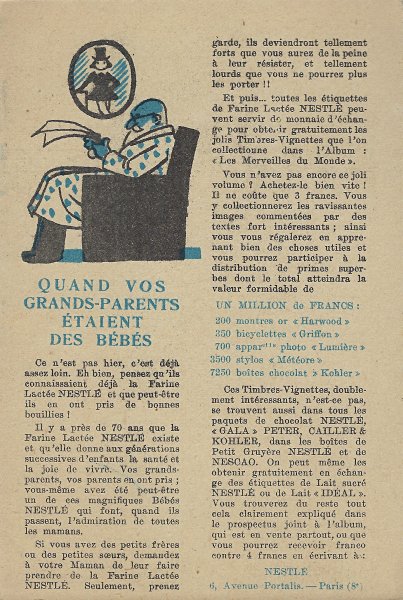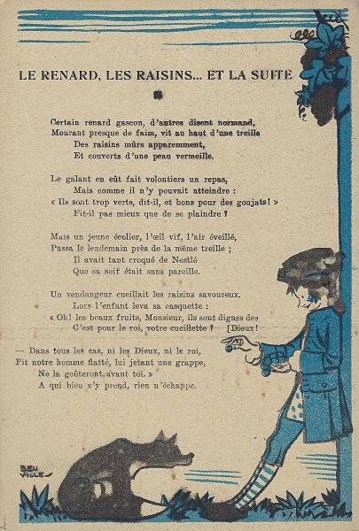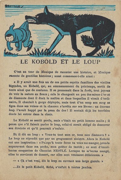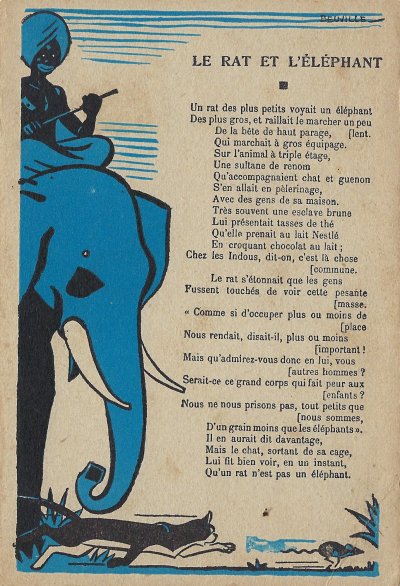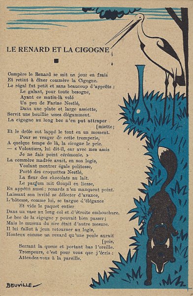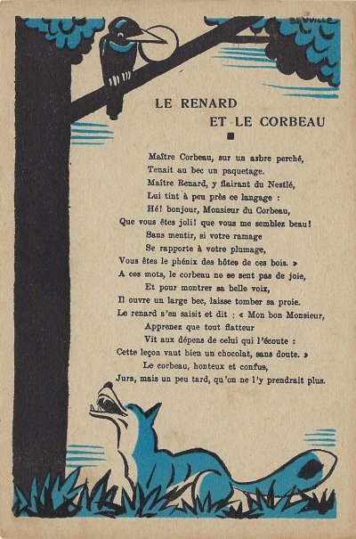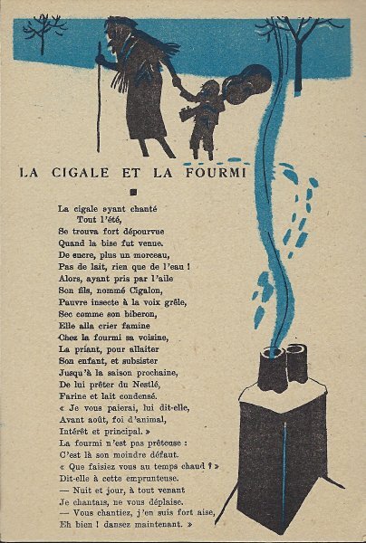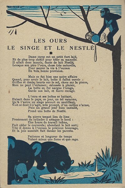 Because in many ways the backs of these cards are more interesting than the fronts, I will include each here. They seem to be tips for pupils, always including an advertisement for Nestlé chocolate in one form or another. Some backs recommend reaching to Nestlé during the times when one gets hungry between meals, for example. The "applied" fables seem to me to be forced, as when a monkey's opening a can of Nestlé saves the day for a bear family. The true story of FG turns out to include a young student who had his Nestlé and knew that the grapes were good. He got one of them! The versos offer fascinating inquiries. "Did you do your work this week?" "Let's make a collection!" "When your grandparents were babies." "Do you like dishes with cream?" My, what questions! 4¾' x 7". - Source