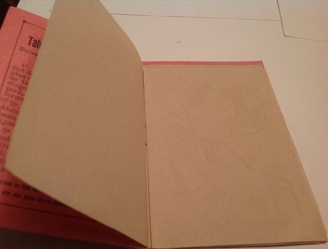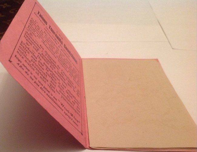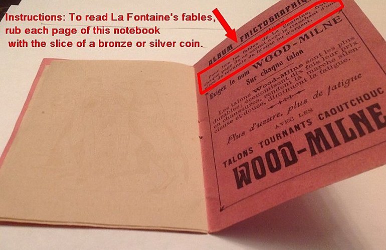 This is surely one of the more curious parts of the collection! Fortunately, there has been little attempt to do what the instructions on the inside back cover, as featured in Bertrand's photo below, call for: rubbing the apparently empty inside pages to find each revealing a fable of La Fontaine. Clever attempts on my scanner have failed to make the outlines of these images appear without rubbing the pages. I will certainly take Bertrand's word for it that these two pamphlets are rare, and I suspect that having both of them, with different sets of fables in each, is even rarer. My, where fables show up can be surprising! - Source