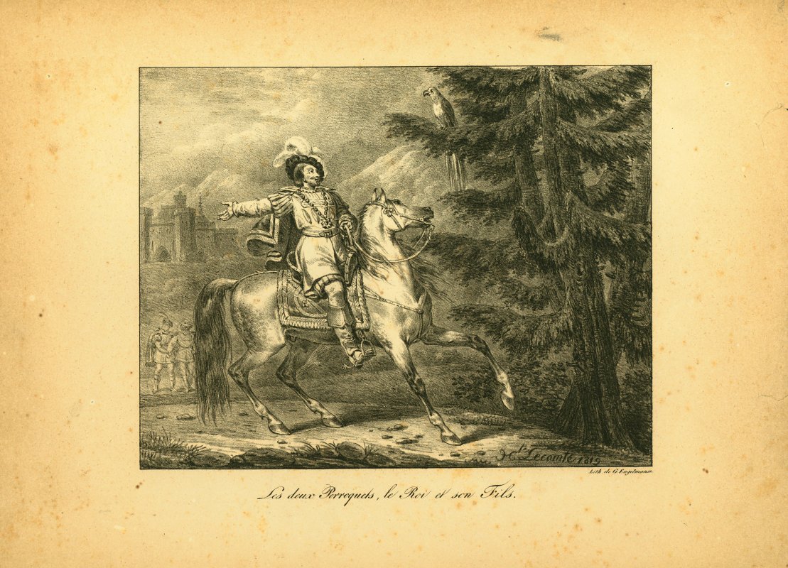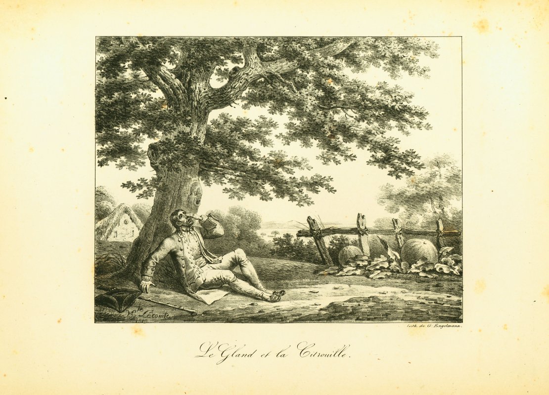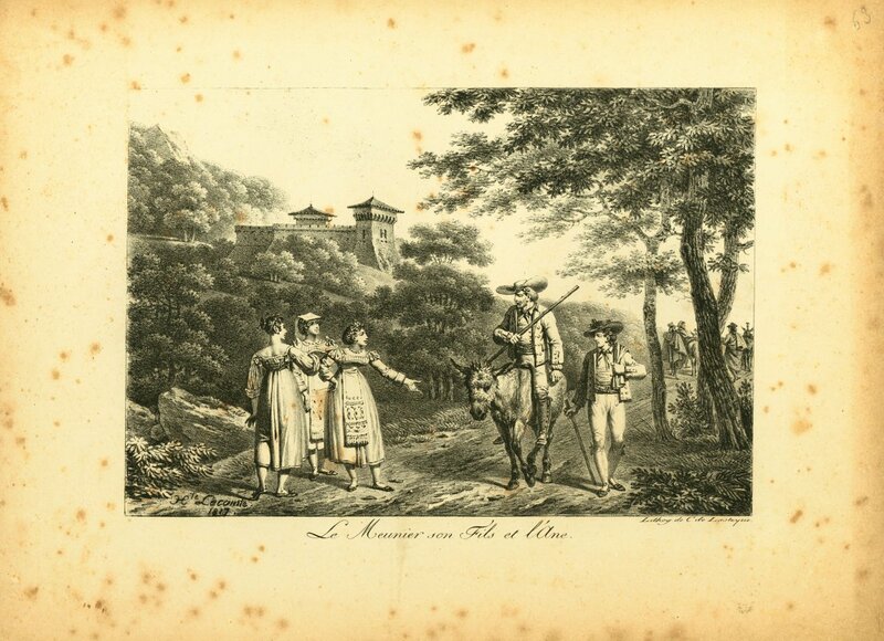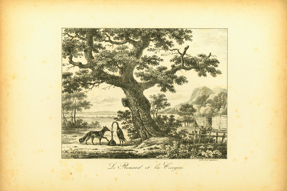Engelmann seems to be the engraver for many of these. I have assigned him authorship for those not signed by LeComte or Vernet. These seem to be pages from a book in our collection, "Fables choisies De La Fontaine ornees de figures lithographiques" from 1818, published by Engelmann. - Date