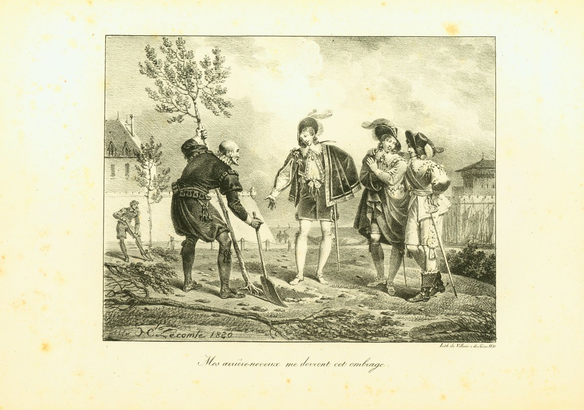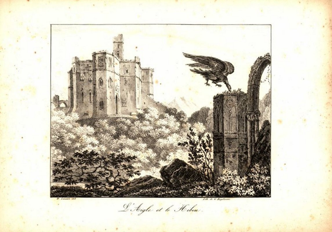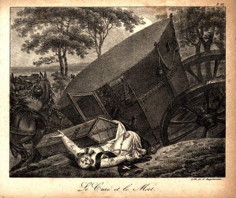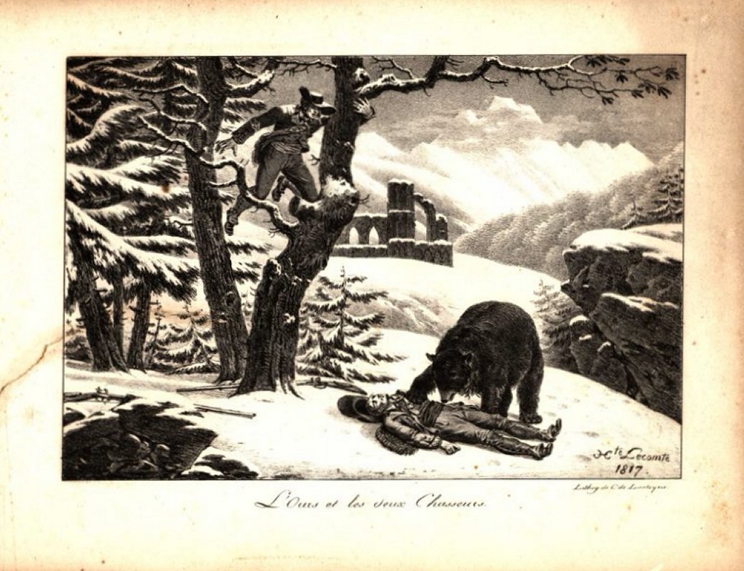 Engelmann seems to be the engraver for many of these. I have assigned him authorship for those not signed by LeComte or Vernet. These seem to be pages from a book in our collection, "Fables choisies De La Fontaine ornees de figures lithographiques" from 1818, published by Engelmann. - Date