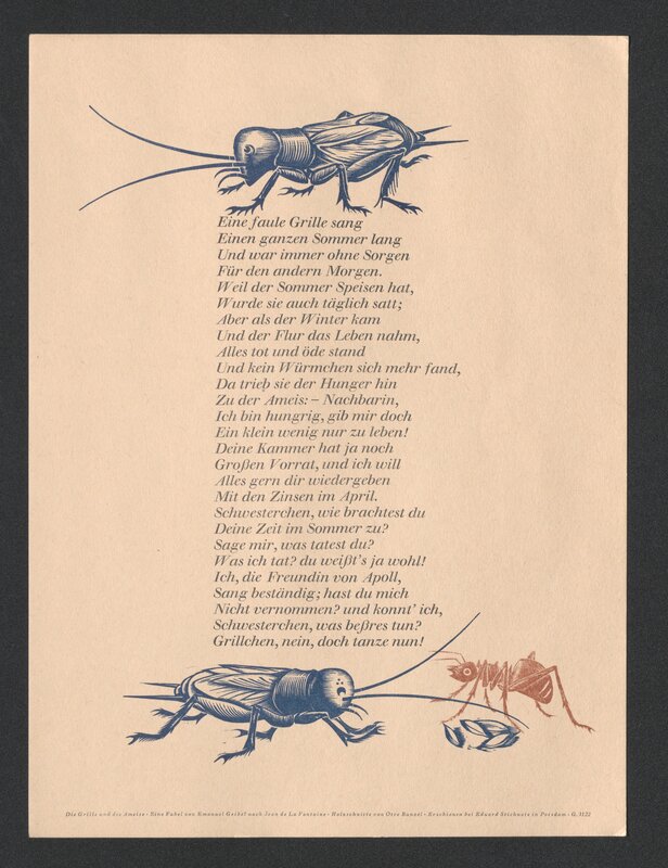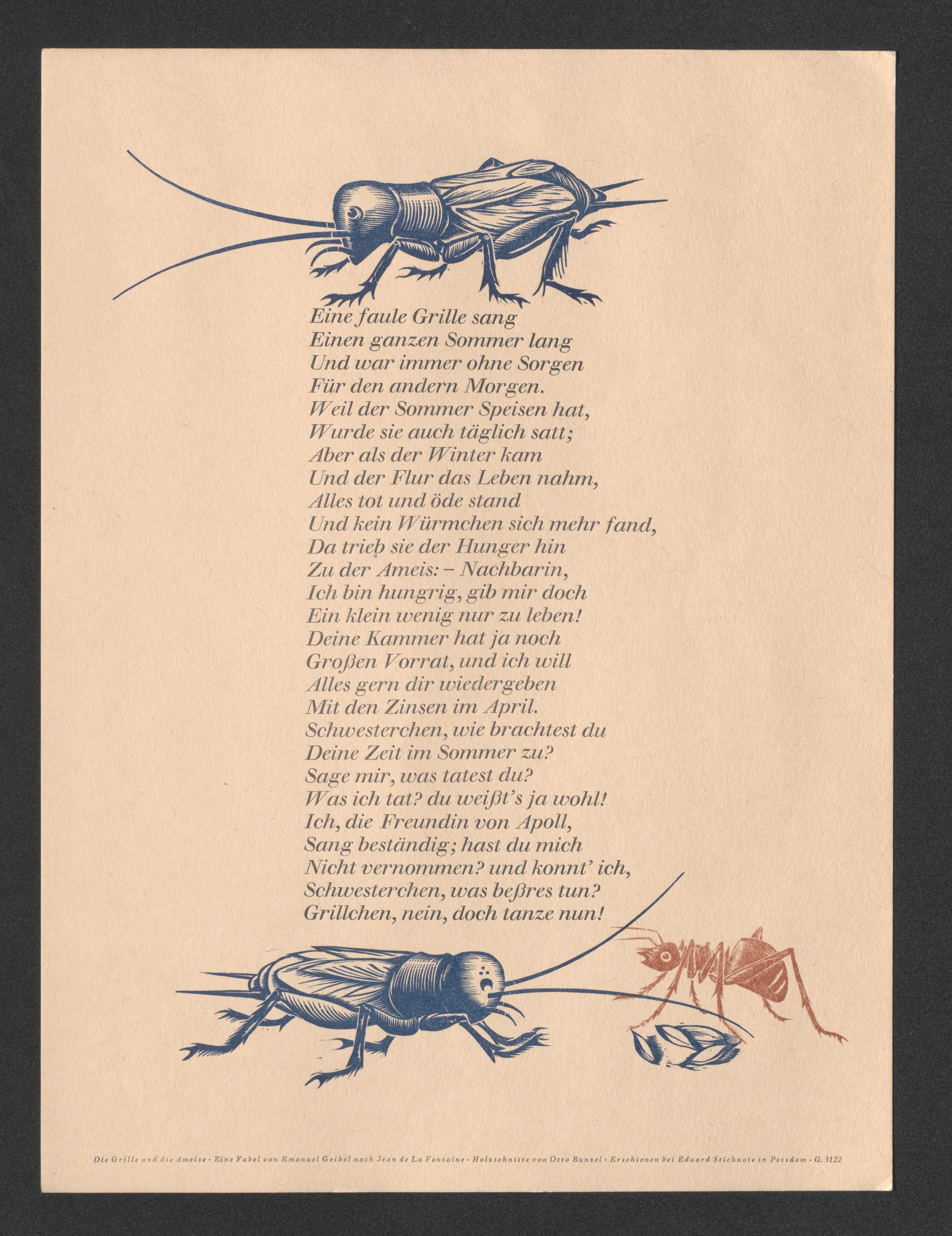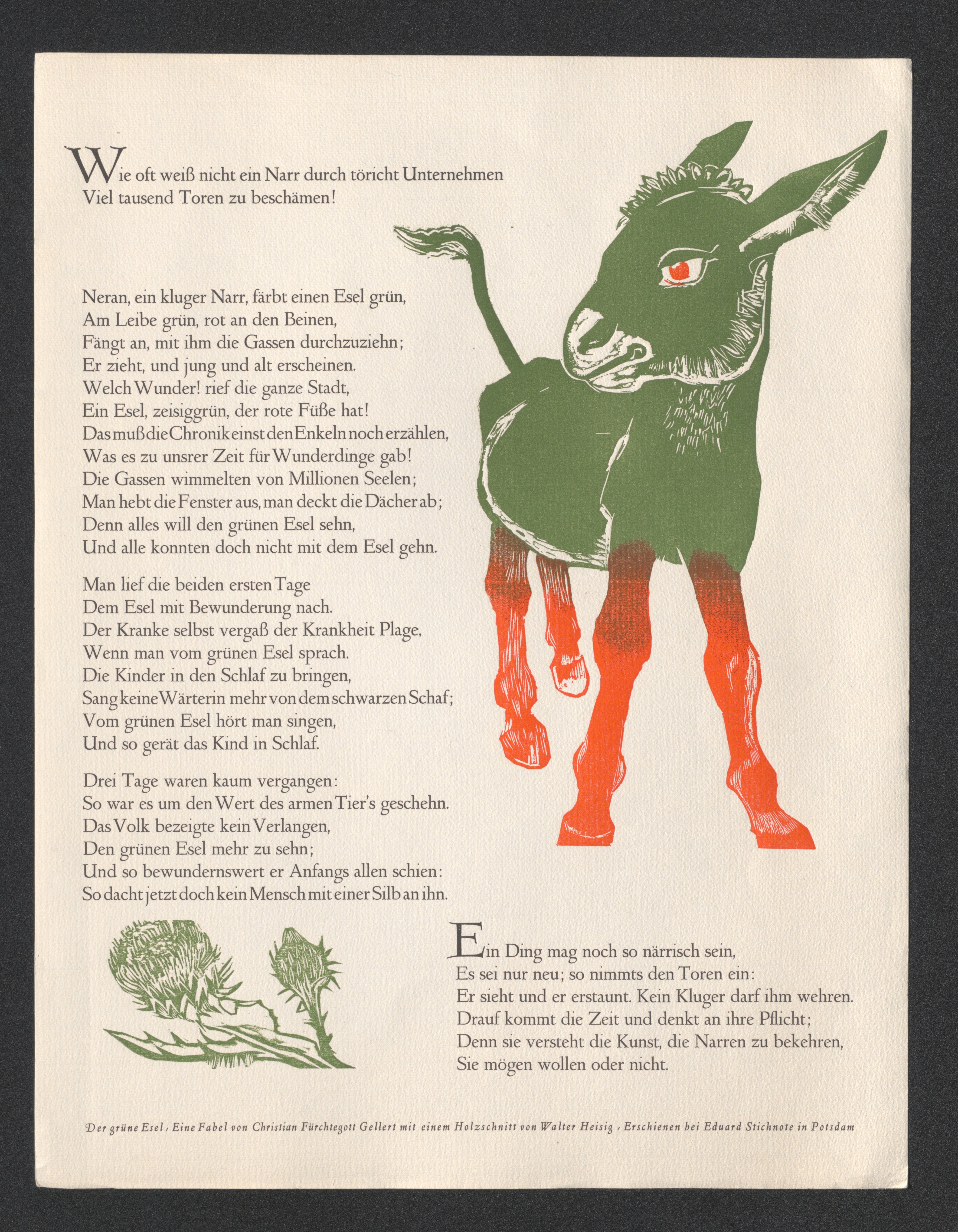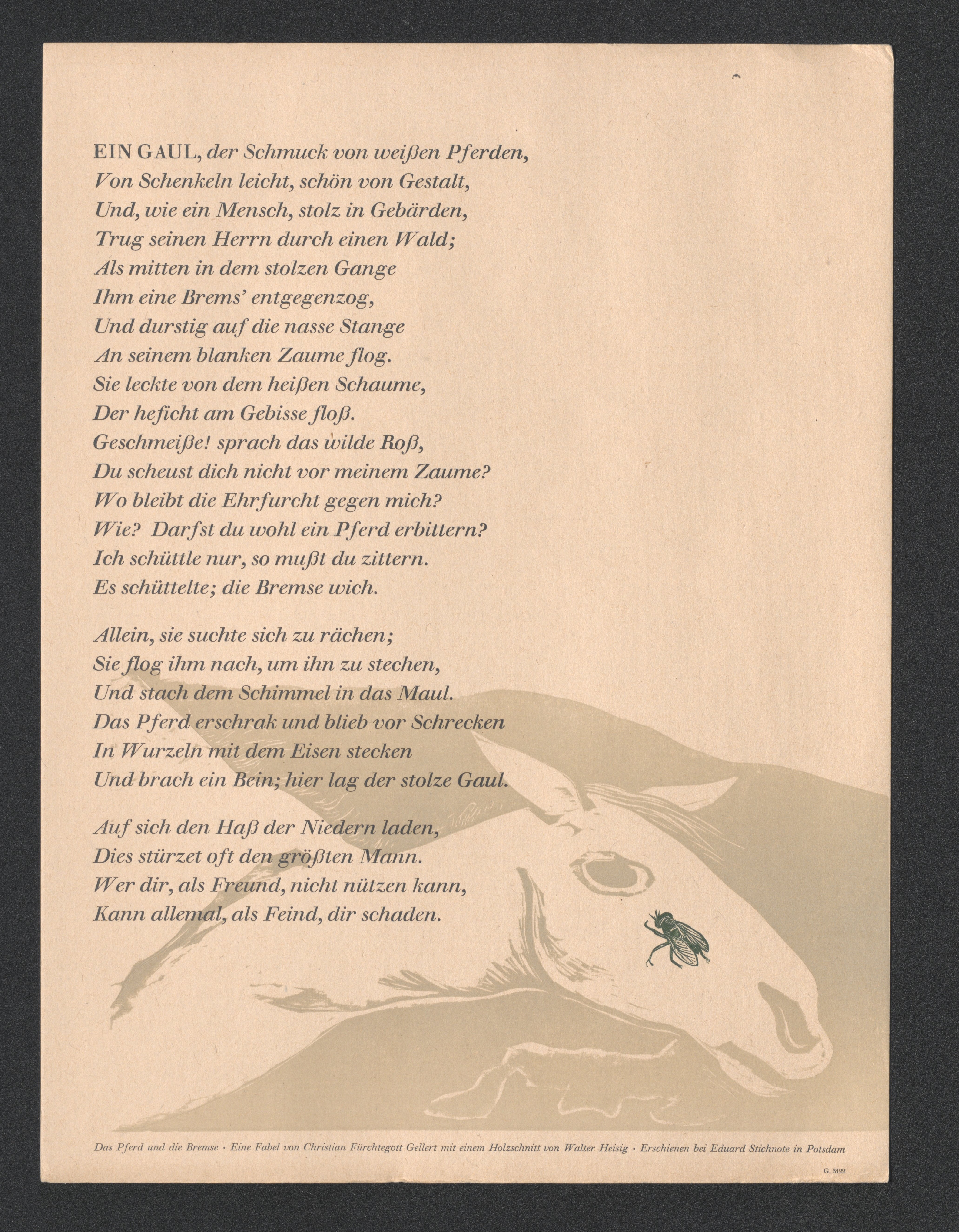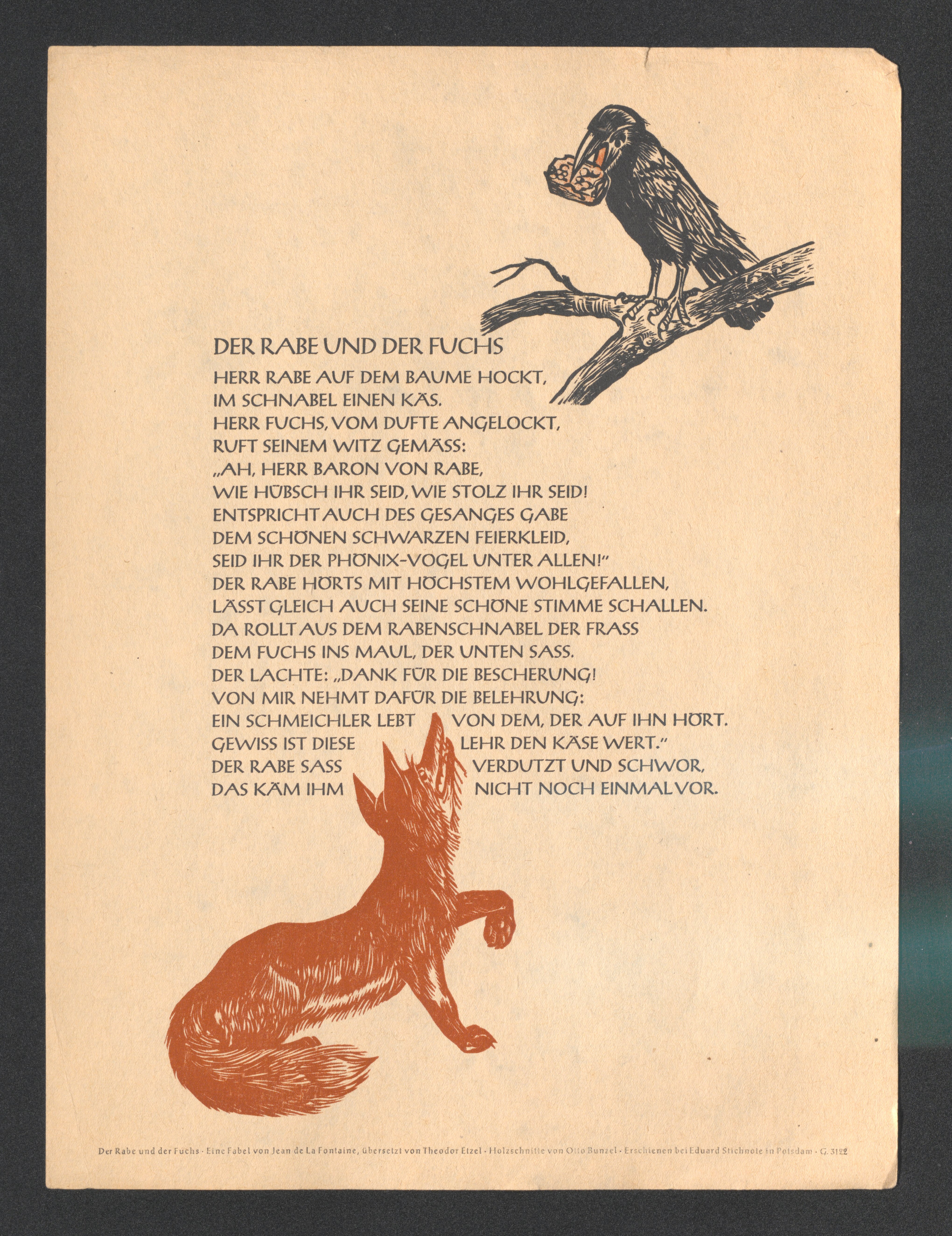 1947 "Zehn Fabeln," portfolio of prints printed by Eduard Stichnote in Potsdam. Artists: Walter Heisig; Otto Bunzel; Hans Leistikow; and Max Debus. 3 partial collections in portfolios whose flap shows a list of the ten. Unknown sources.