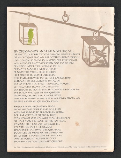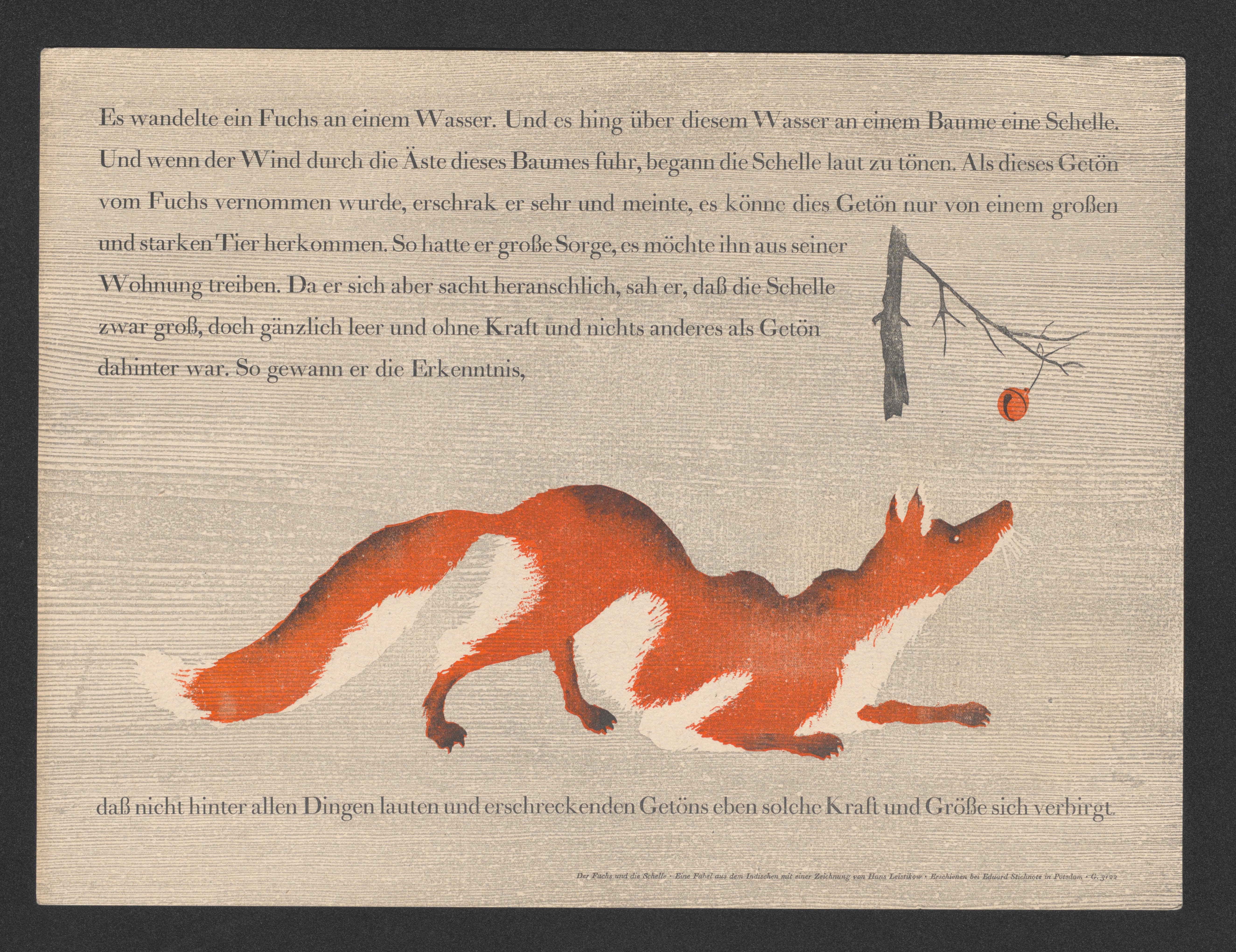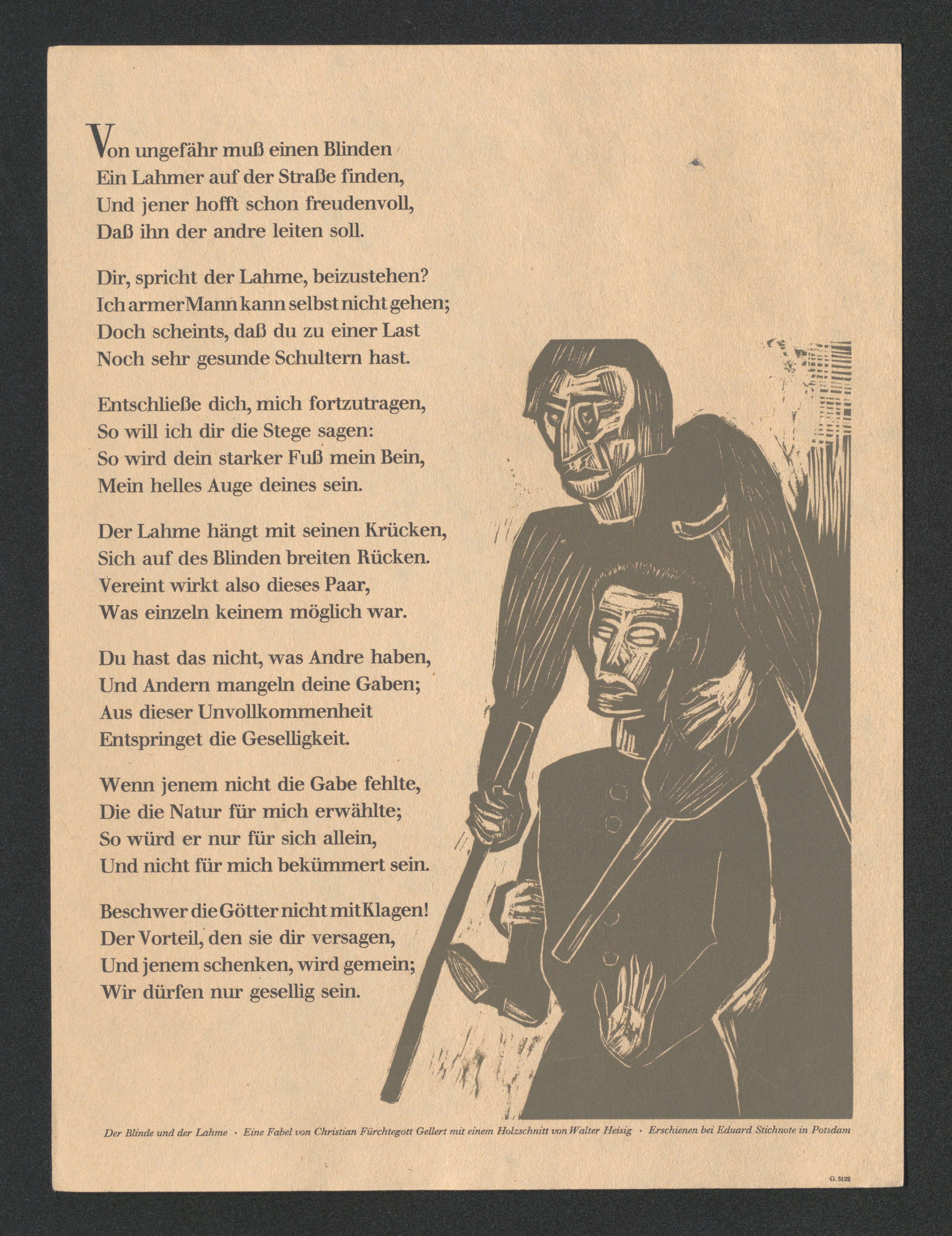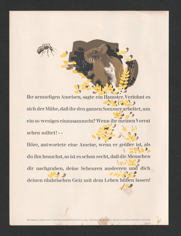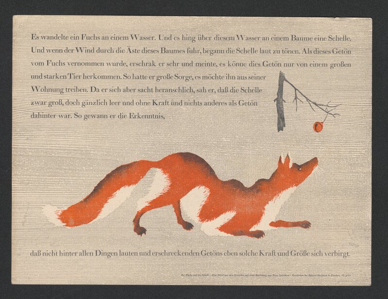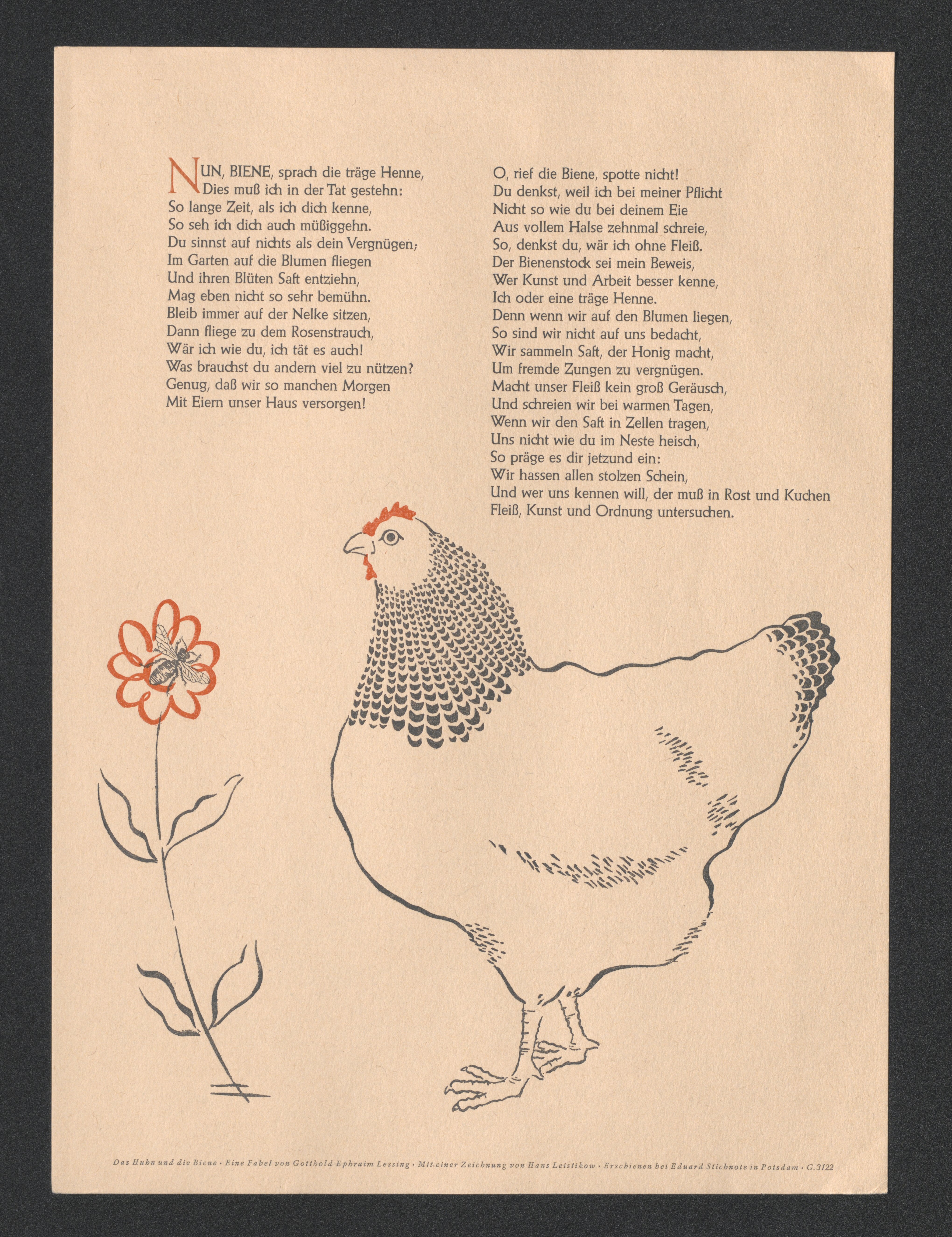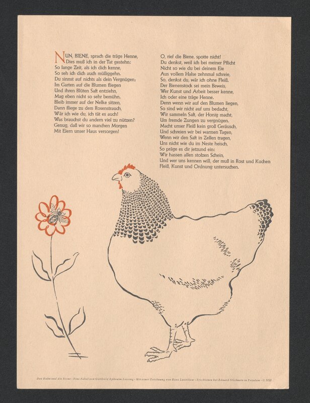 1947 "Zehn Fabeln," portfolio of prints printed by Eduard Stichnote in Potsdam. Artists: Walter Heisig; Otto Bunzel; Hans Leistikow; and Max Debus. 3 partial collections in portfolios whose flap shows a list of the ten. Unknown sources.