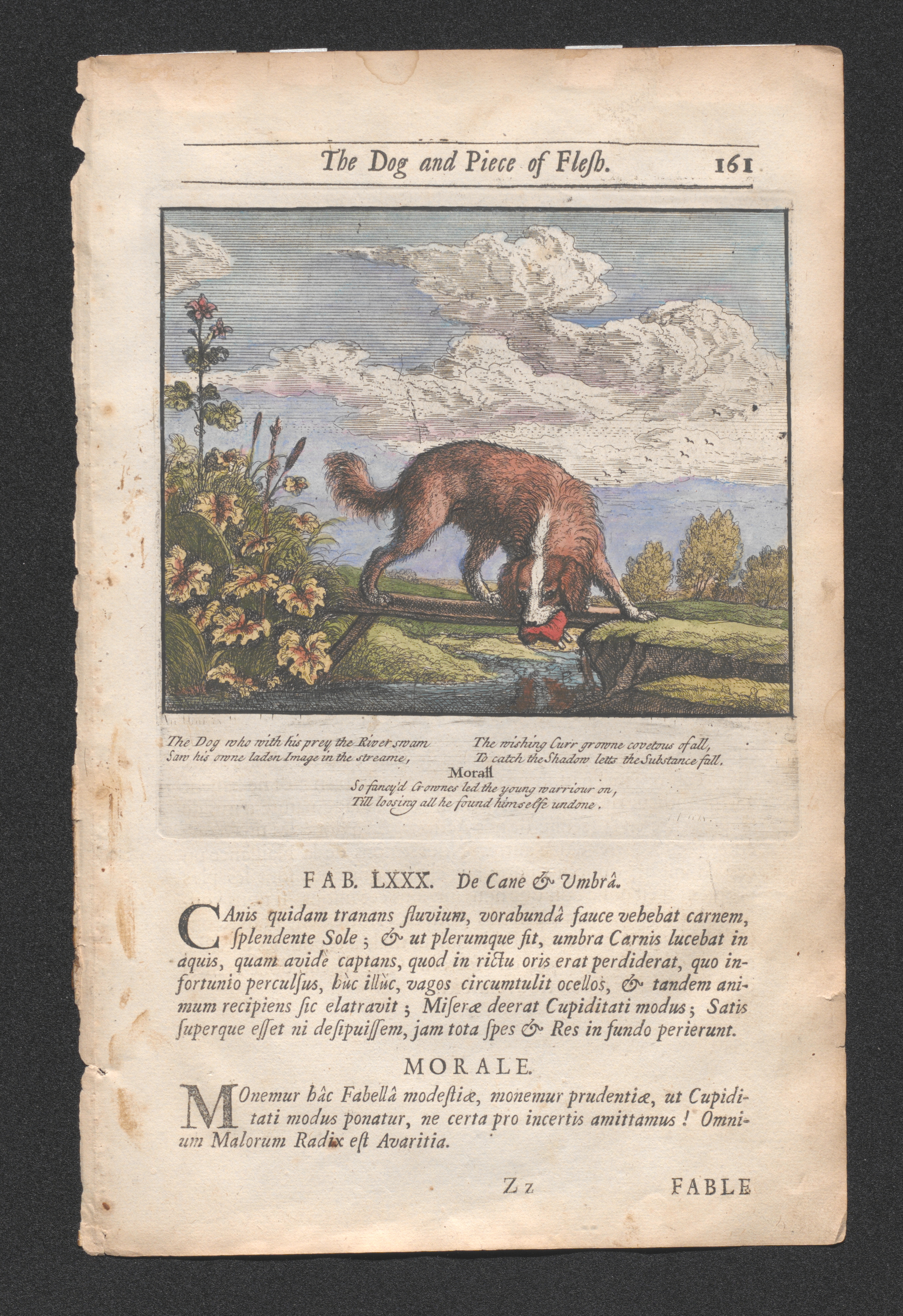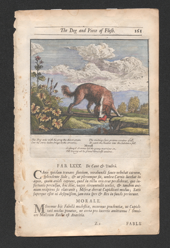 1687 Eight hand-painted leaves from Francis Barlow’s “Aesop’s Fables with his Life,” second edition. $400 from girlbookseller75 on Ebay, June, ’25.