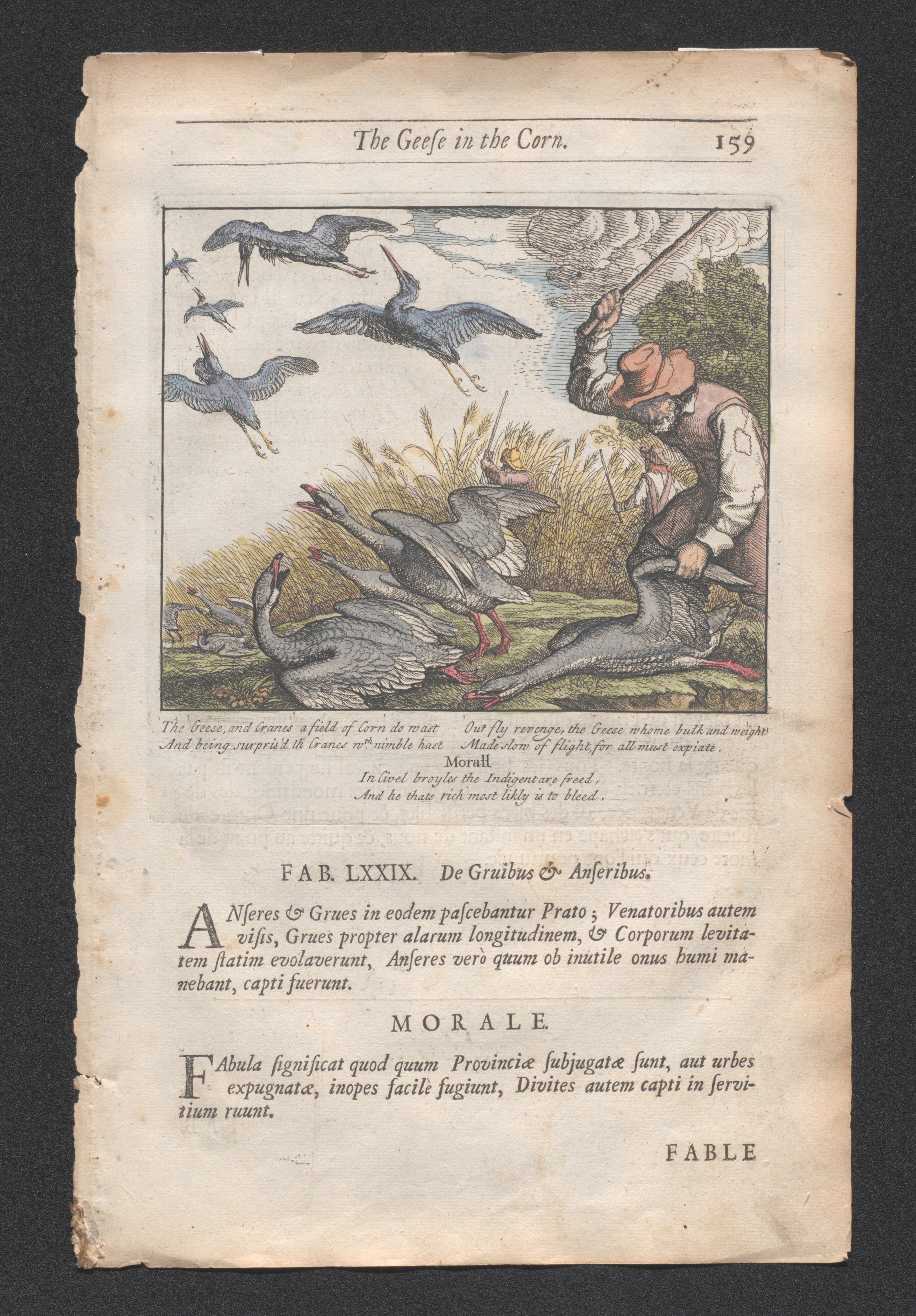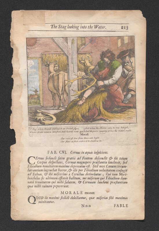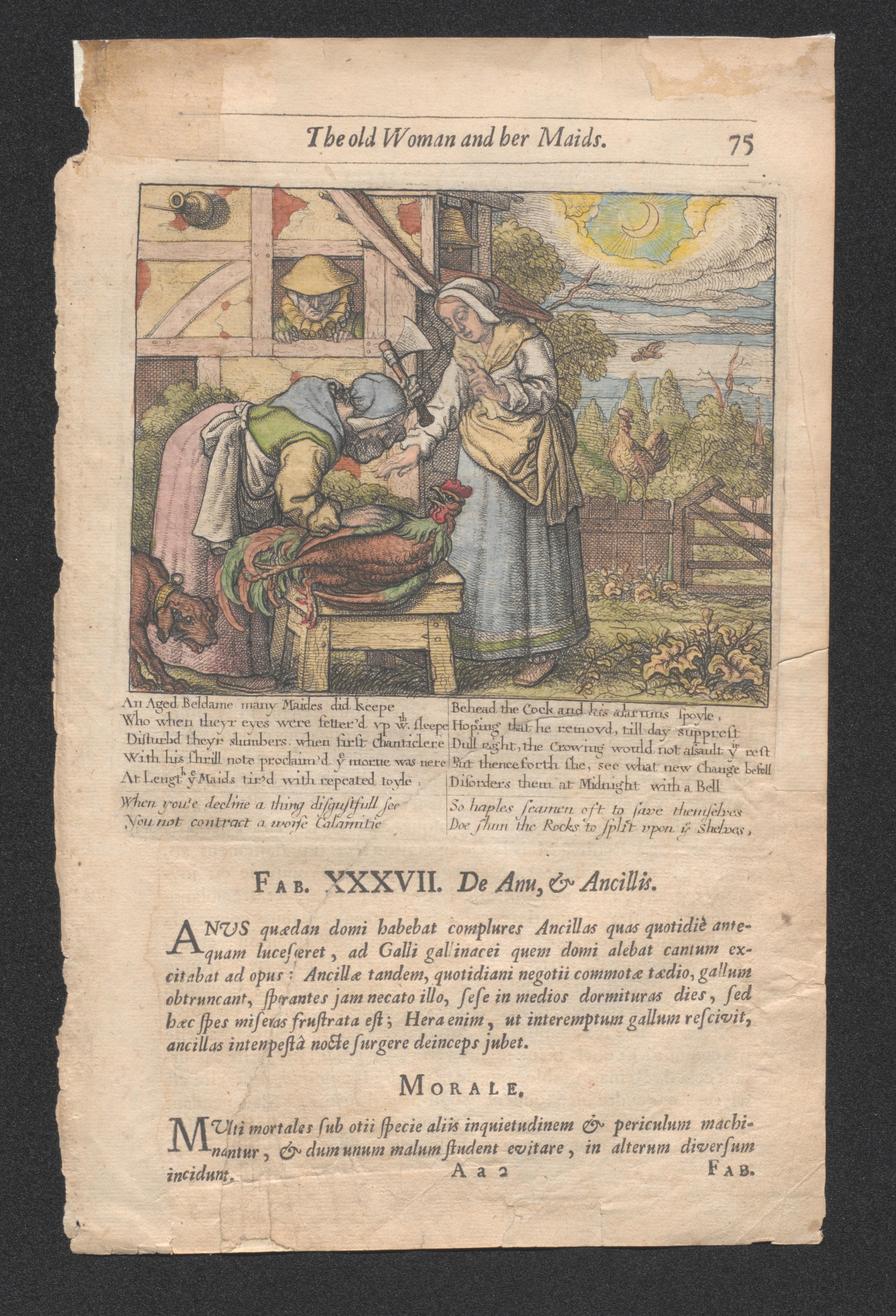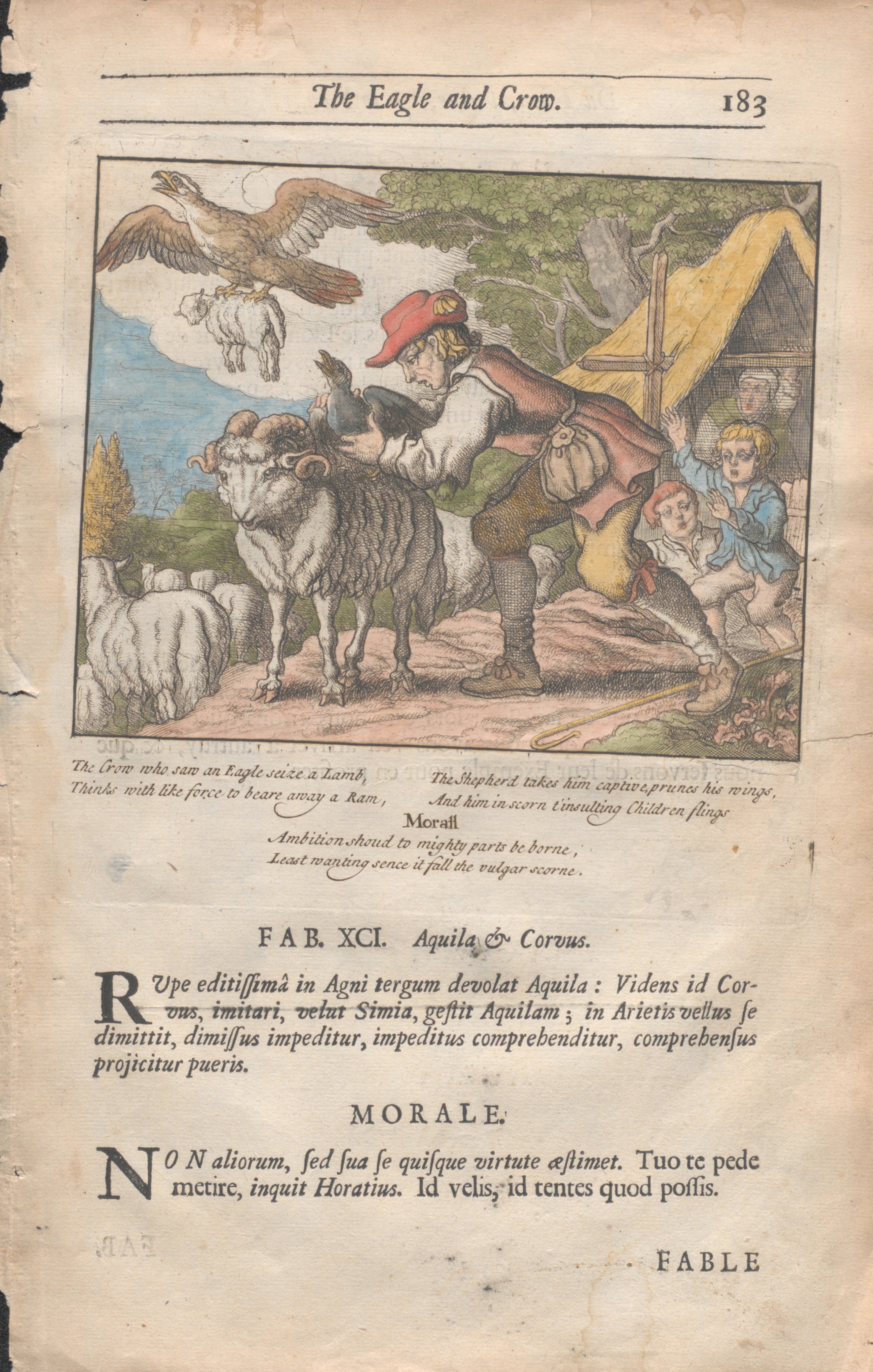 These are exquisitely painted leaves! I look forward to showing them off together with our first edition Barlow from 1666. My two favorites among them are DS and “The Eagle and the Crow.” And I love the face of the old woman looking out the window as the two girls kill the cock. Notice the error on 213. The page’s title is “The Stag Looking into the Water.” That fits with the Latin text and moral, which were presumably printed together with the page’s title. But the illustration is for a different fable, “The Master’s Eye,” about a stag hiding in a stall and eluding notice until the master enters the barn. The English text, printed with the illustration, is the correct one for “The Master’s Eye.” Several of the illustrations are printed slightly askew on the page. Beautiful work! - Date