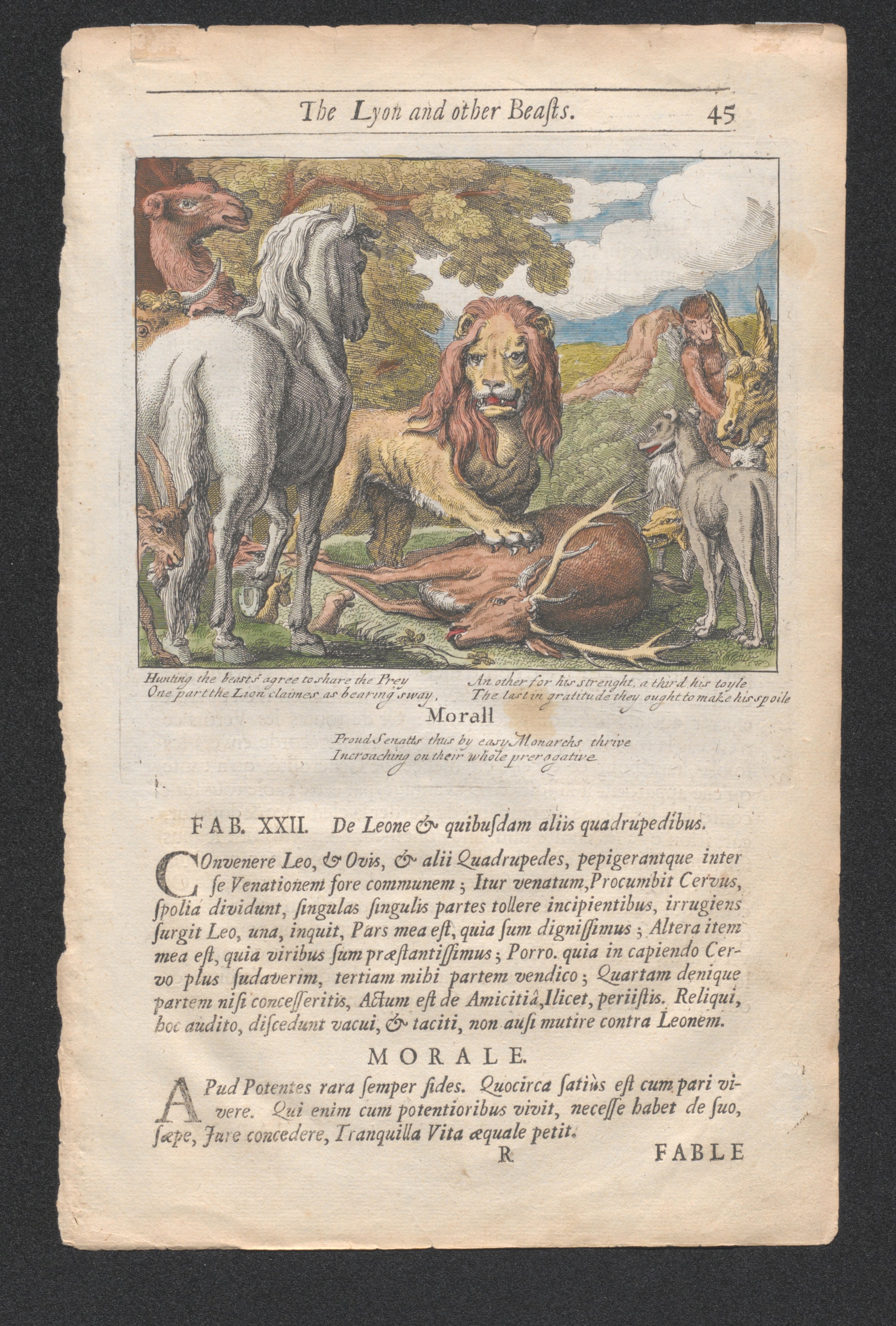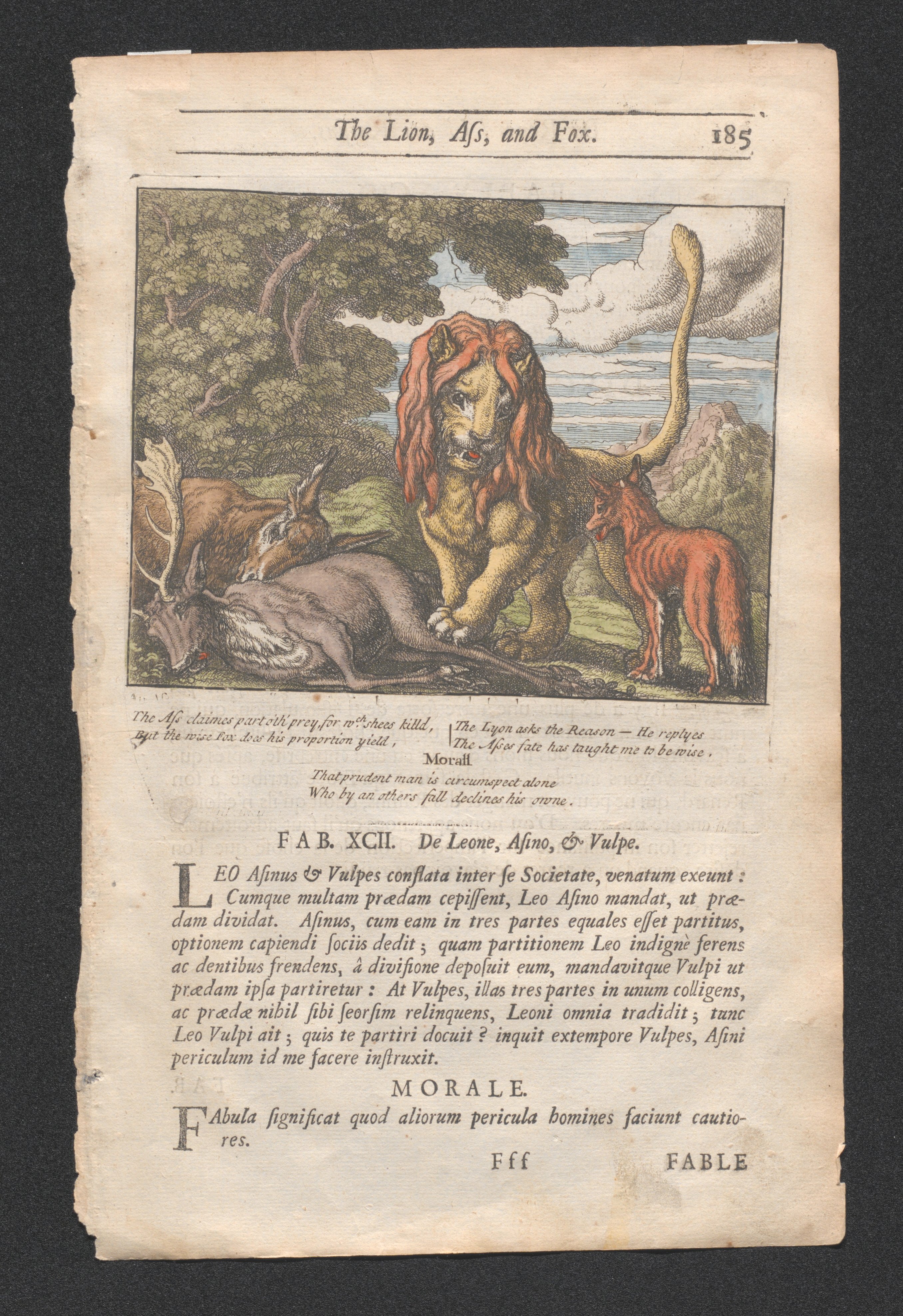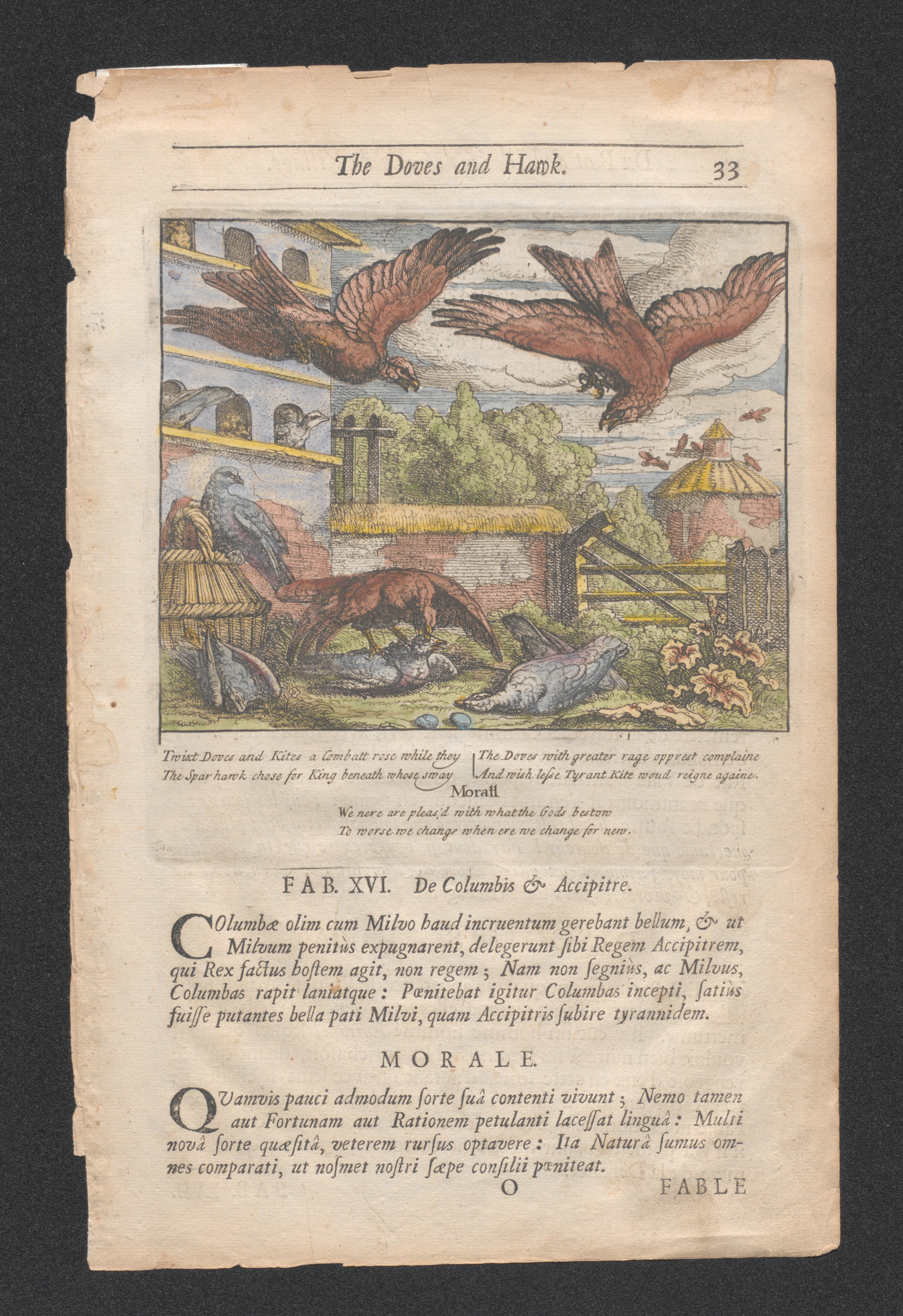 These are exquisitely painted leaves! I look forward to showing them off together with our first edition Barlow from 1666. My two favorites among them are DS and “The Eagle and the Crow.” And I love the face of the old woman looking out the window as the two girls kill the cock. Notice the error on 213. The page’s title is “The Stag Looking into the Water.” That fits with the Latin text and moral, which were presumably printed together with the page’s title. But the illustration is for a different fable, “The Master’s Eye,” about a stag hiding in a stall and eluding notice until the master enters the barn. The English text, printed with the illustration, is the correct one for “The Master’s Eye.” Several of the illustrations are printed slightly askew on the page. Beautiful work! - Date