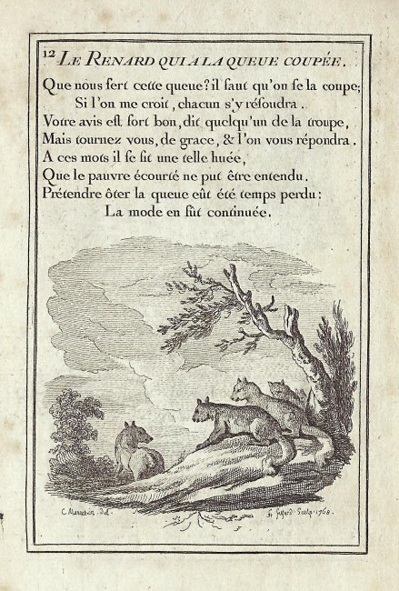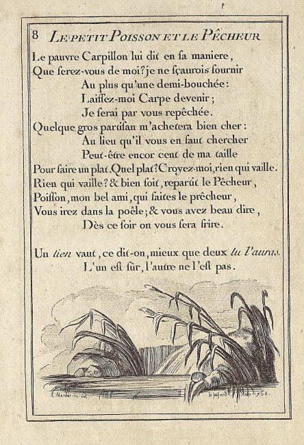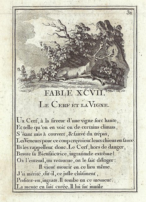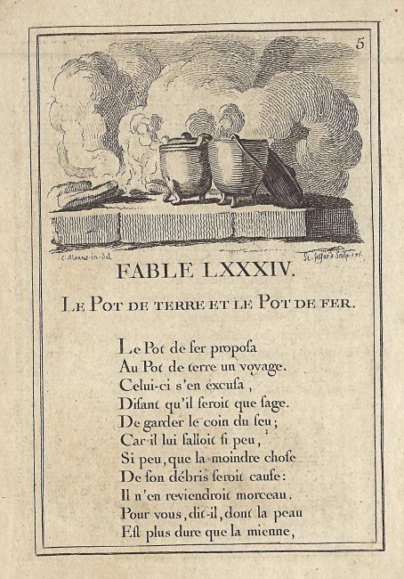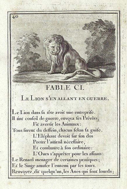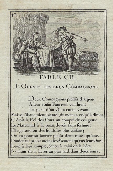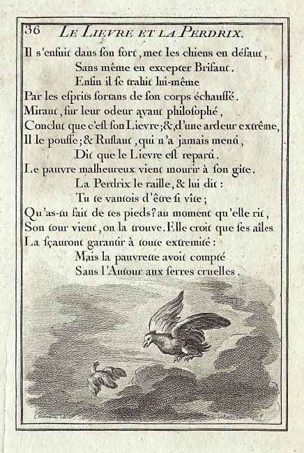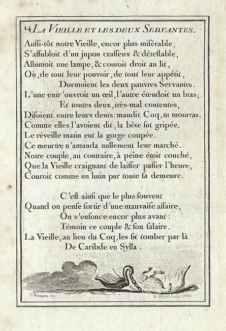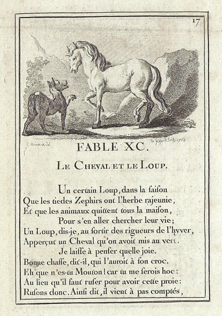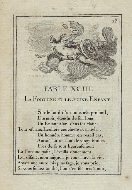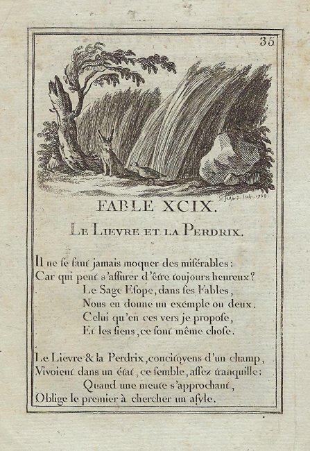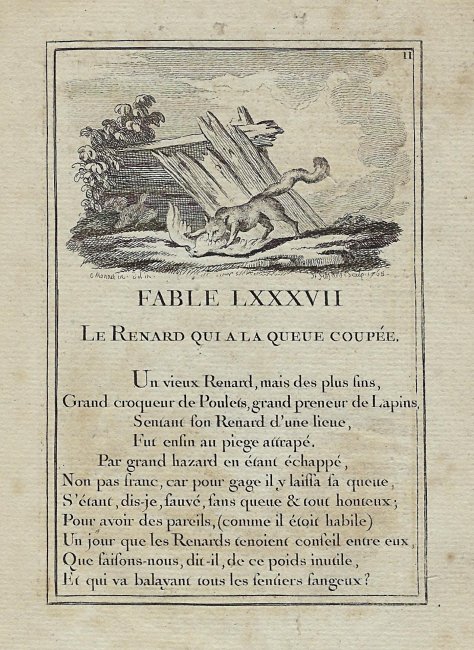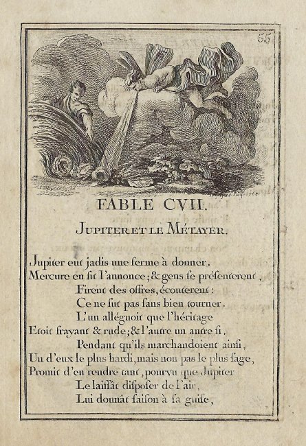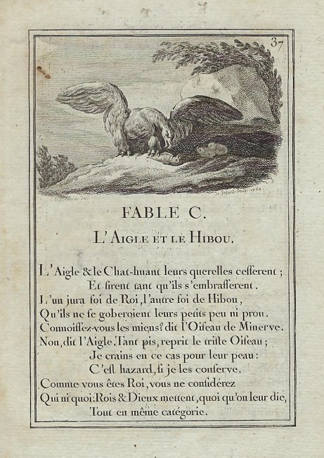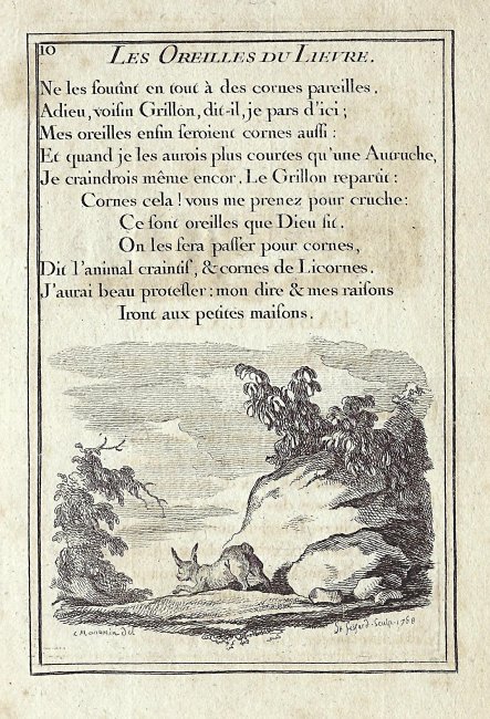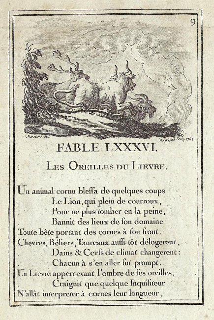 1768 A set of pages removed from Volume III of Etienne Fessard's edition of La Fontaine's fables. Pages represented are 1 (the beginning of Book V: Fable LXXXIII) – 14; 17 – 24; 31 – 32; 35 – 42; and 51 - 56. $49.99 from Biblio Emporium through Ebay, August, '20.