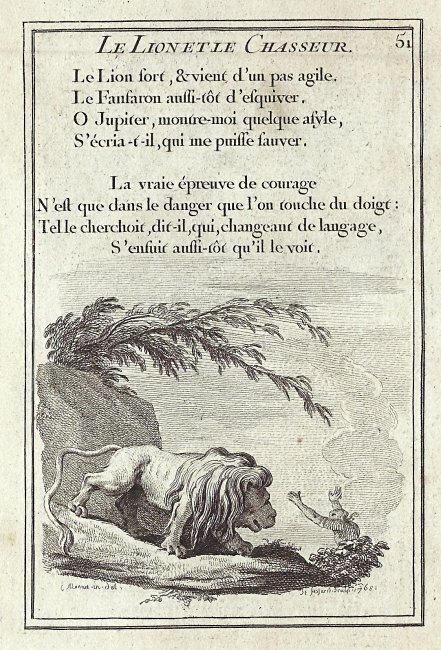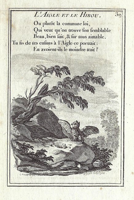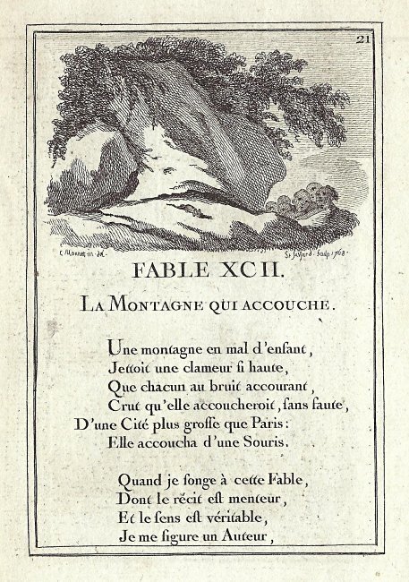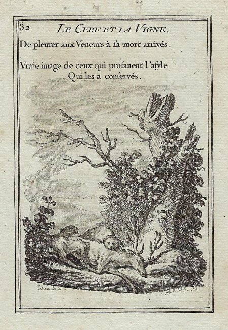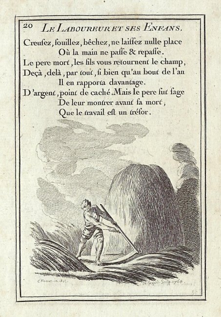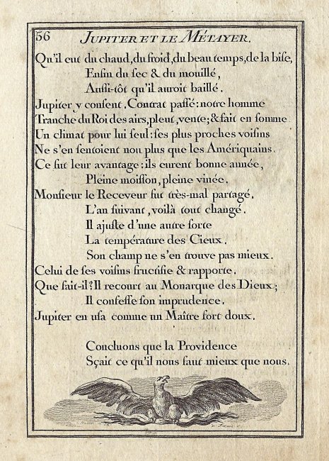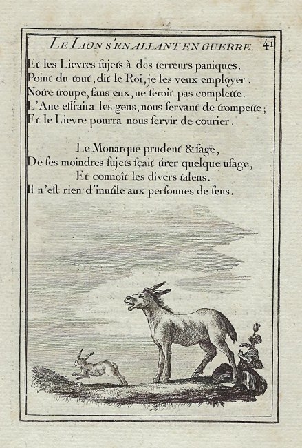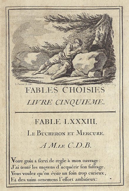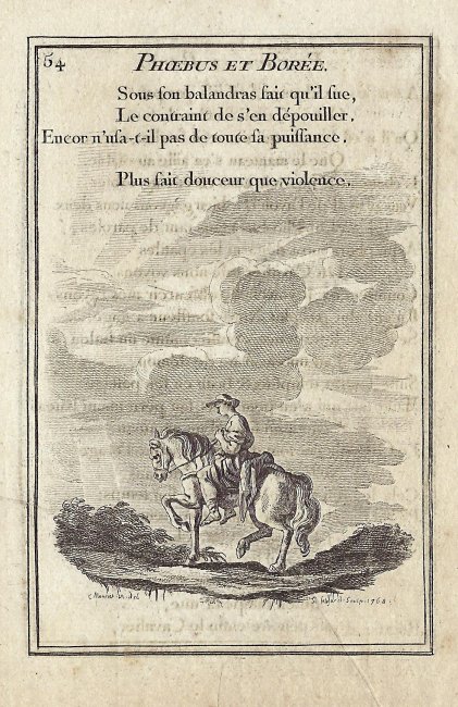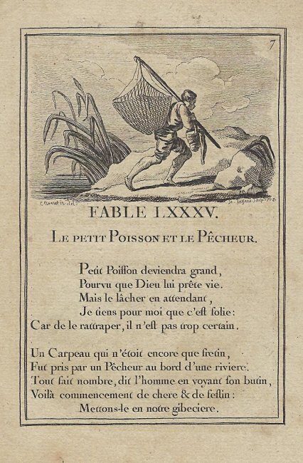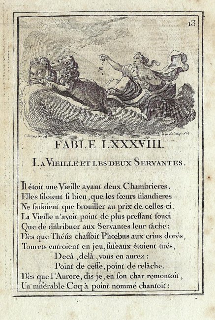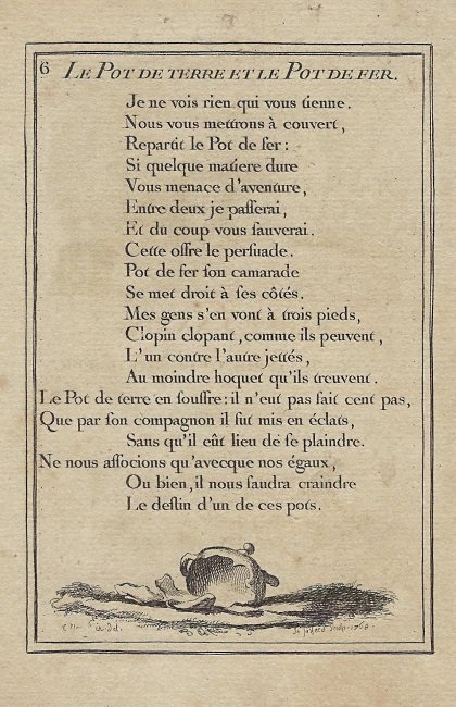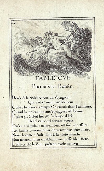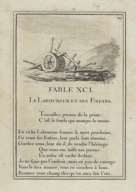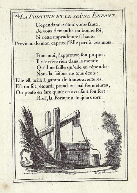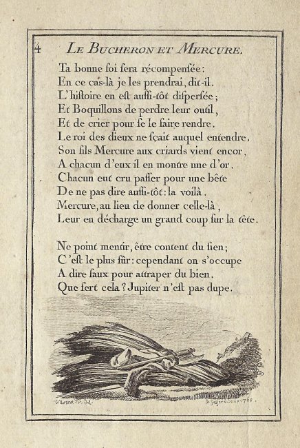1768 A set of pages removed from Volume III of Etienne Fessard's edition of La Fontaine's fables. Pages represented are 1 (the beginning of Book V: Fable LXXXIII) – 14; 17 – 24; 31 – 32; 35 – 42; and 51 - 56. $49.99 from Biblio Emporium through Ebay, August, '20.