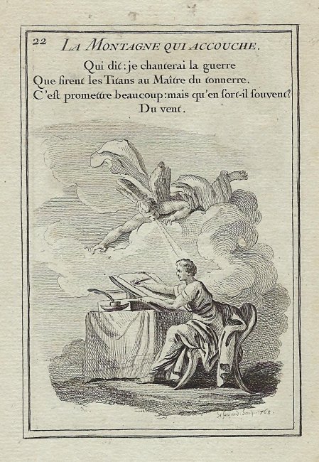 Here is a set of pages taken from Volume III of Fessard's monumental six-volume edition of La Fontaine's fables, according to Bodemann the first fully illustrated volume. The pages were sold as coming from 1768, but the name mentioned in its advertising was Charles Monnet and the description was "chapbook." I gather that the difference between Monnet and Fessard represents the age-old tension between artist and engraver. In any case, I was so delighted with these illustrations that I scanned them all and present them here in smaller and larger versions. Not every fable represented here has both its full title illustration and its endpiece. - Date