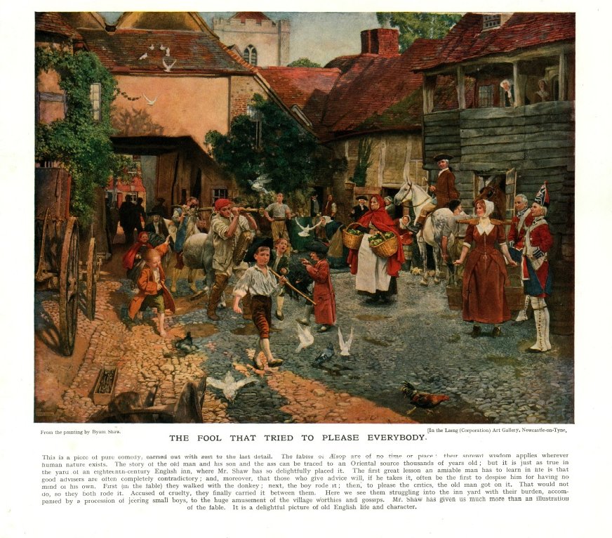 This is a piece of pure comedy, carried out with zest to the last detail. The fables of Aesop are of no time or place: their shrewd wisdom applies wherever human nature exists. The story of the old man and his son and the ass can be traced to an Oriental source thousands of years old; but it is just as true in the yard of an eighteenth-century English inn, where Mr. Shaw has so delightfully placed it. The first great lesson an amiable man has to learn in life is that good advisers are often completely contradictory; and, moreover, that those who give advice will, if he takes it, often be the first to despise him for having no mind of his own. First (in the fable) they walked with the donkey; next, the boy rode it; then: to please the critics, the old man got on it. That would not do, so they both rode it. Accused of cruelty, they finally carried it between them. Here we see them struggling into the inn yard with their burden, accompanied by a procession of jeering small boys, to the huge amusement of the village worthies and gossips. Mr. Shaw has given us much more than an illustration of the fable. It is a delightful picture of old English life and character. - Date