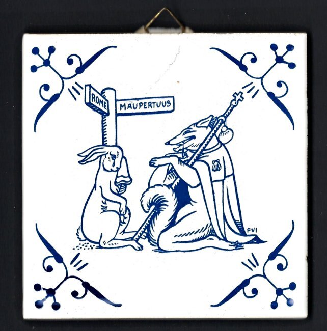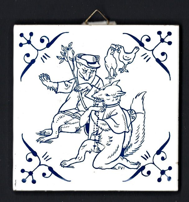 The three tiles come from a restaurant that in 2012 apparently became "Het Wijnhuis." While only one of the three pictures a fable scene, I am happy to include those celebrating Renard in two of his major moments, with his victim rabbit and with his supposed pilgrimage companion
