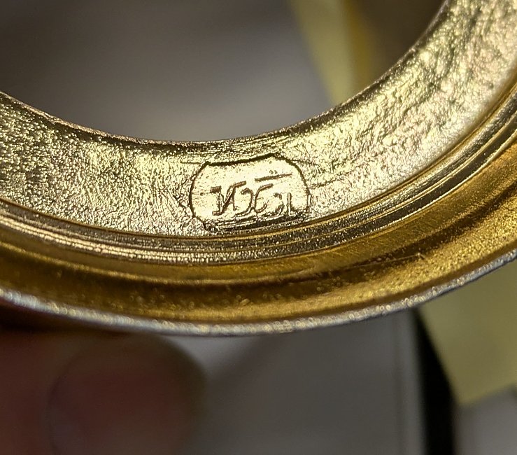 I have found many tea glass holders online but none quite like this. Might it be Russian, paired with the "Sarajevo" plate that is found much more regularly on the web? Clear FS story at the outside center of the rim. There is a clear maker's mark on the bottom of the rim, pictured below. - Date