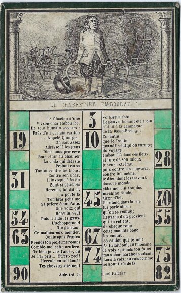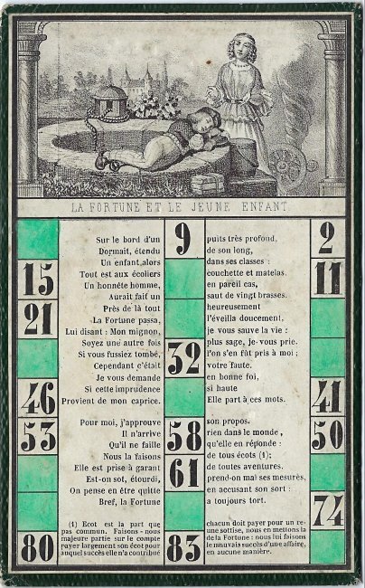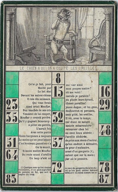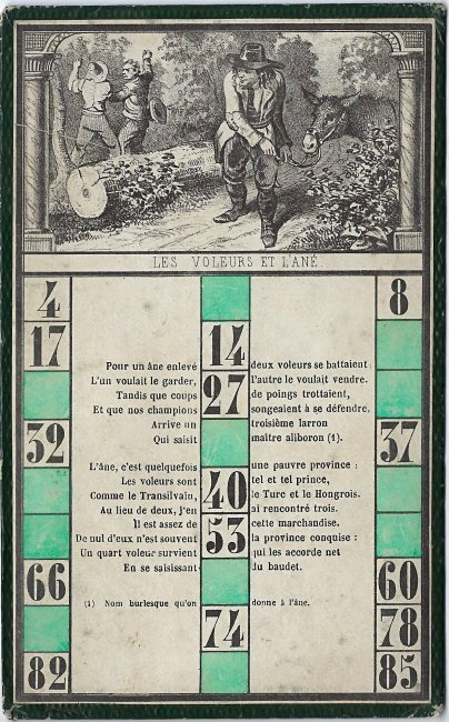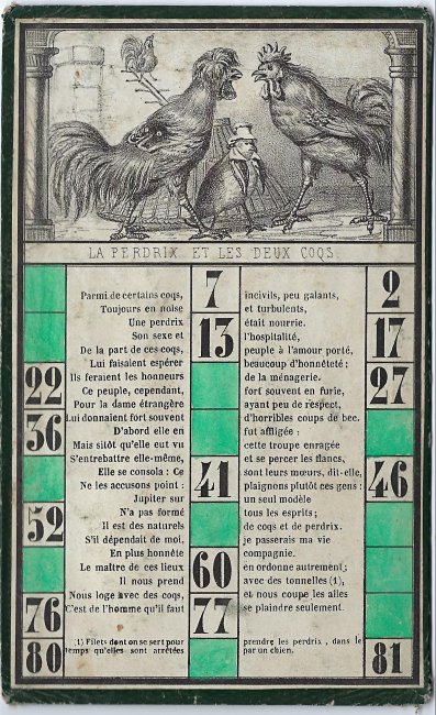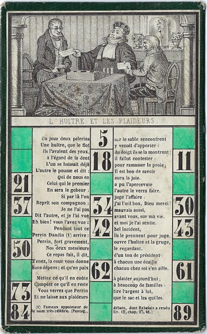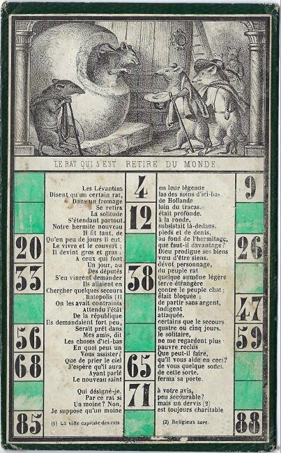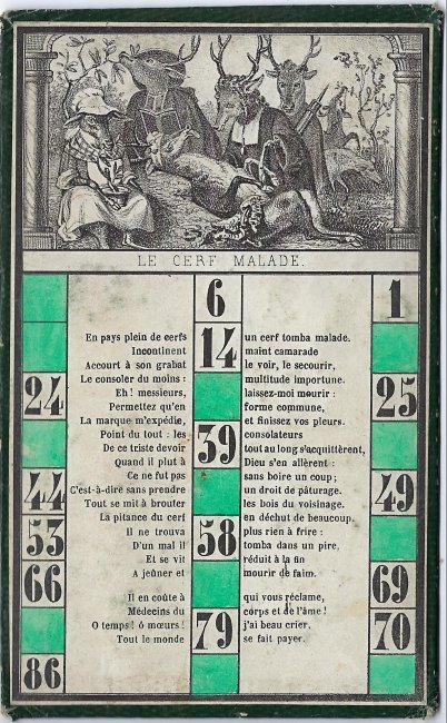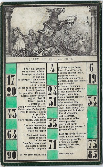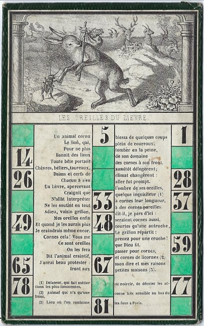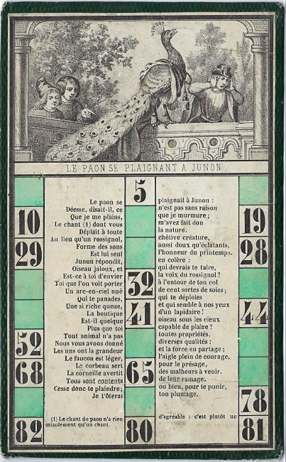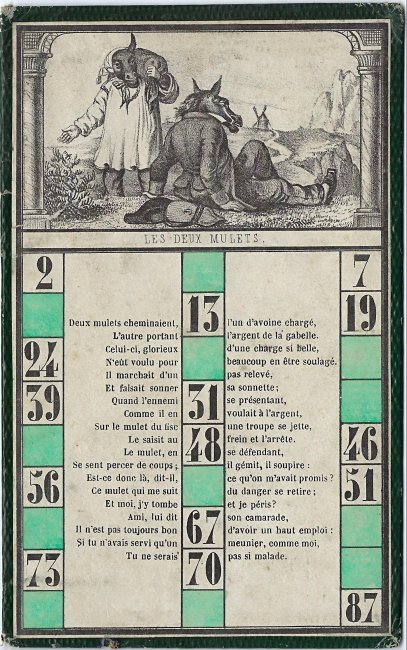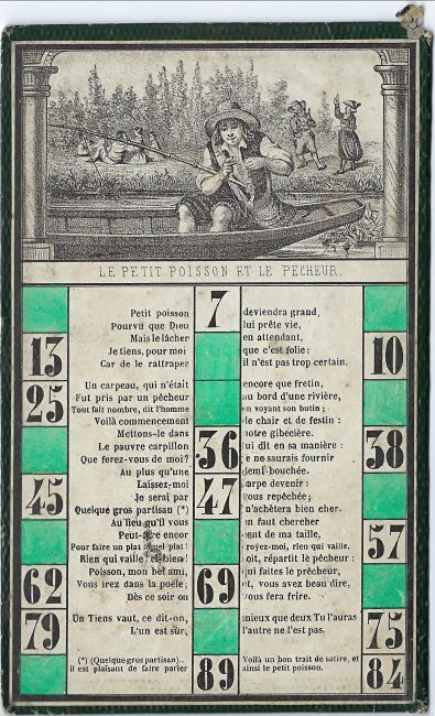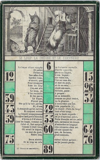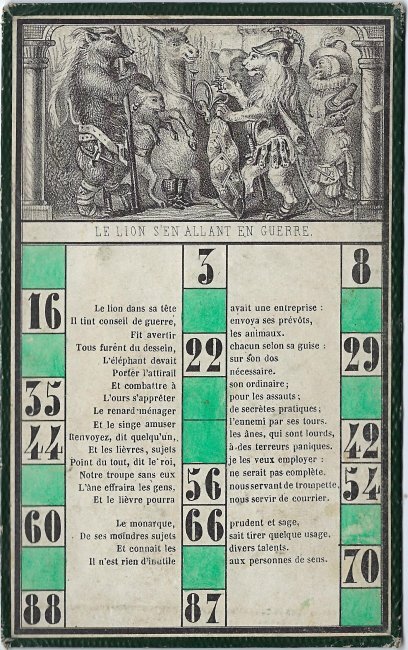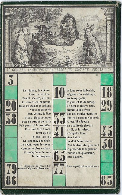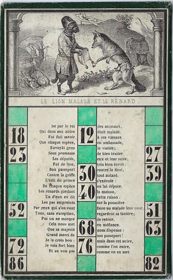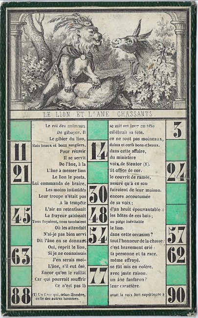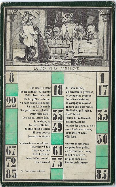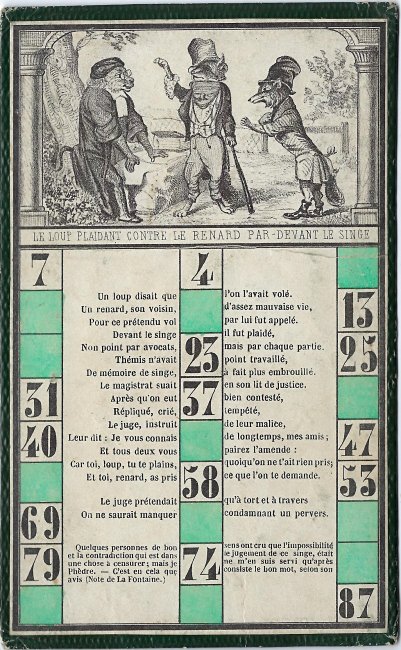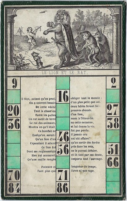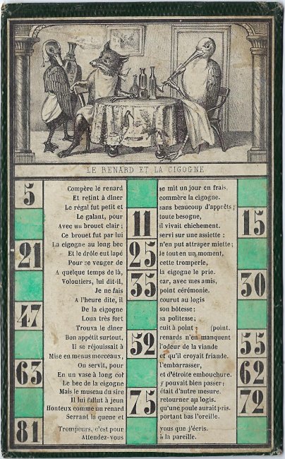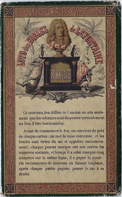 The upper 2½" of each card is taken up with a good rendition after Grandville of an individual fable illustration over a block-print title. The lower 4¼" is taken up with La Fontaine's text and three columns of bingo-like numbers. (The middle column splits the text in cumbersome fashion.) Some cards have one or two footnotes on difficult or antiquated vocabulary. One of the twenty-four cards is outside the pattern. Its upper portion gives the game's title around a bust of La Fontaine, supported by a cabinet. At the center of this cabinet, which is flanked by a fox and a cat, stands "Regle." This card tells us that this "new" game differs from the old one only in its vertical rather than horizontal columns. Apparently, one agrees on the price of each card and pays for his/her cards. Then number-balls are drawn from a sack and called out. For a win, one needs to cover the five numbers in any one column. Unfortunately, there is no real connection between the fables and the game…. I remember seeing this game--I cannot remember where--at a price I could not dream of. I think my favorite fable-collector picked up that copy. I am delighted to find this other copy now! - Date