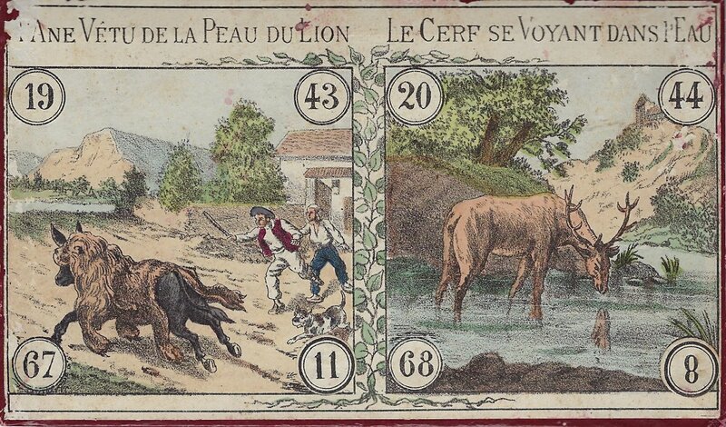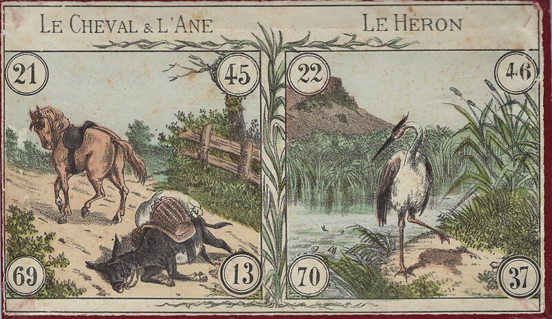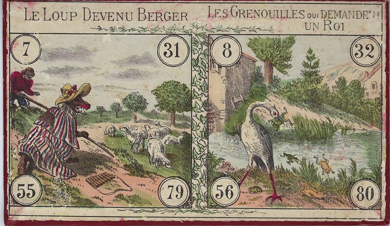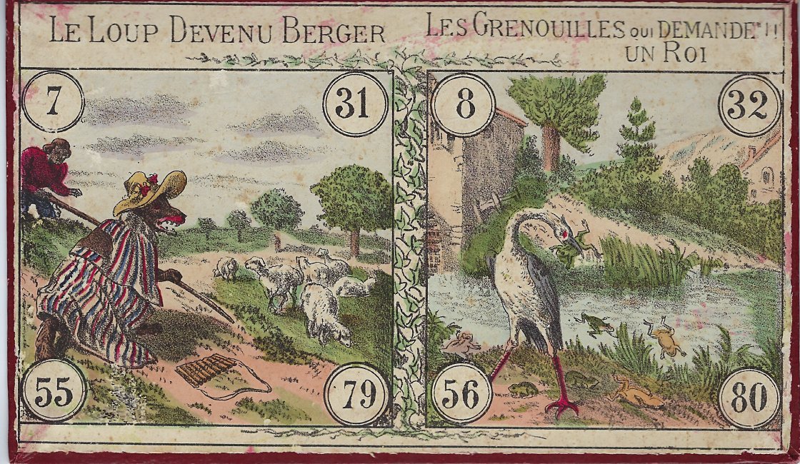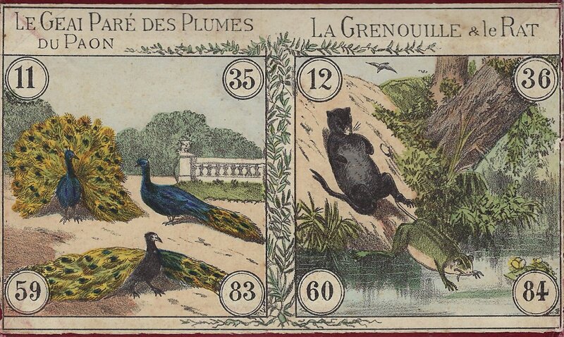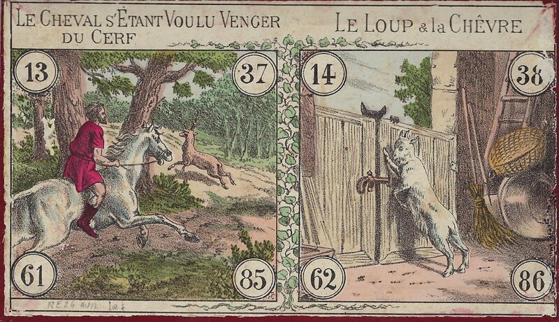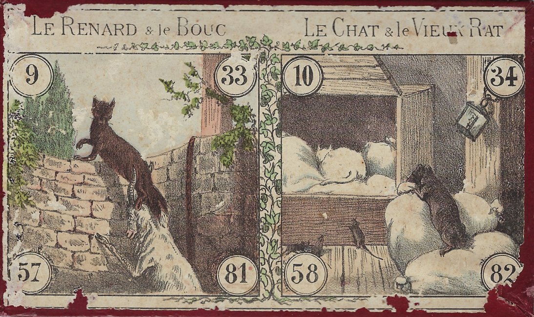 1900? Complete set of twelve lotto cards with red backing, each with two La Fontaine fable images, with titles and four lotto numbers each. €150 from Thierry Corcelle, Paris, June, '19. Six duplicate cards for $45.86 from Alexandra Lacroix of nantes-antiques, Nantes, France, through Ebay, Oct., '20.