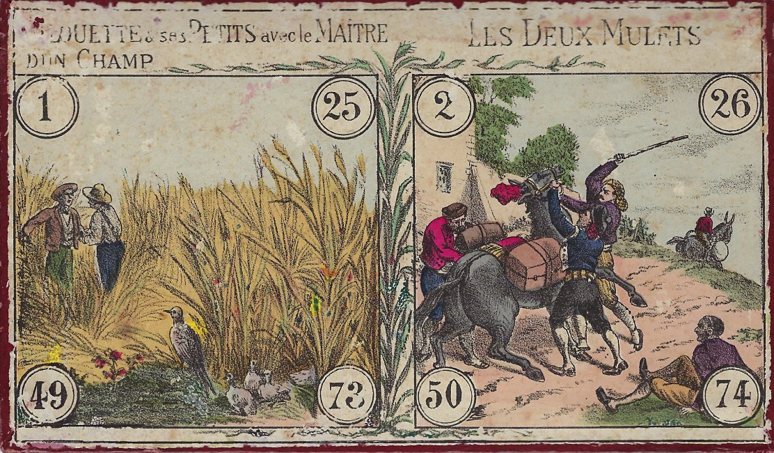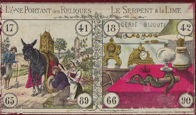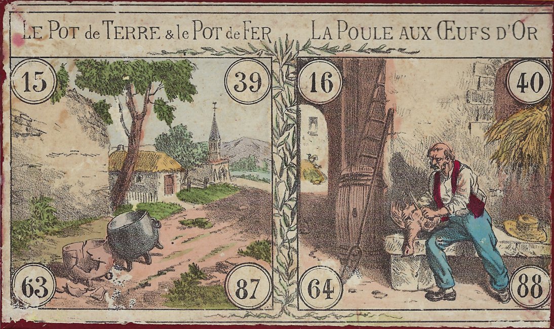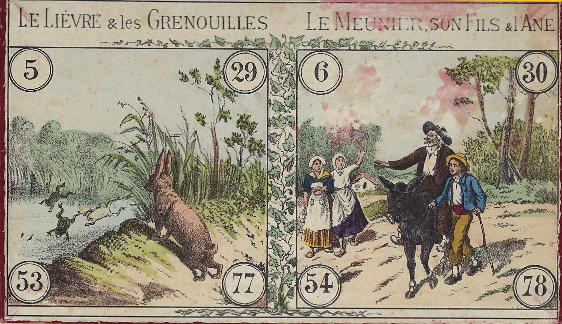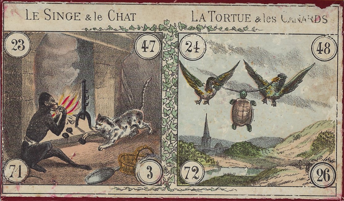 1900? Complete set of twelve lotto cards with red backing, each with two La Fontaine fable images, with titles and four lotto numbers each. €150 from Thierry Corcelle, Paris, June, '19. Six duplicate cards for $45.86 from Alexandra Lacroix of nantes-antiques, Nantes, France, through Ebay, Oct., '20.