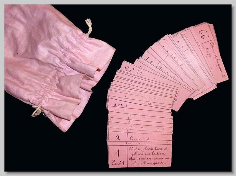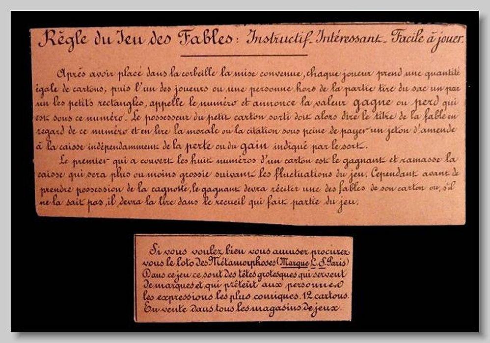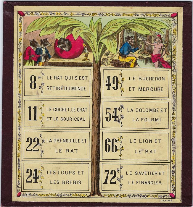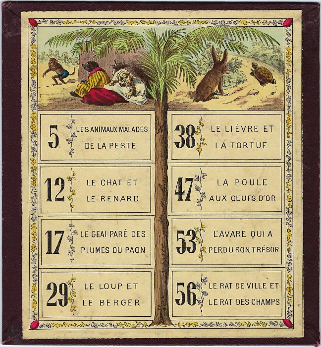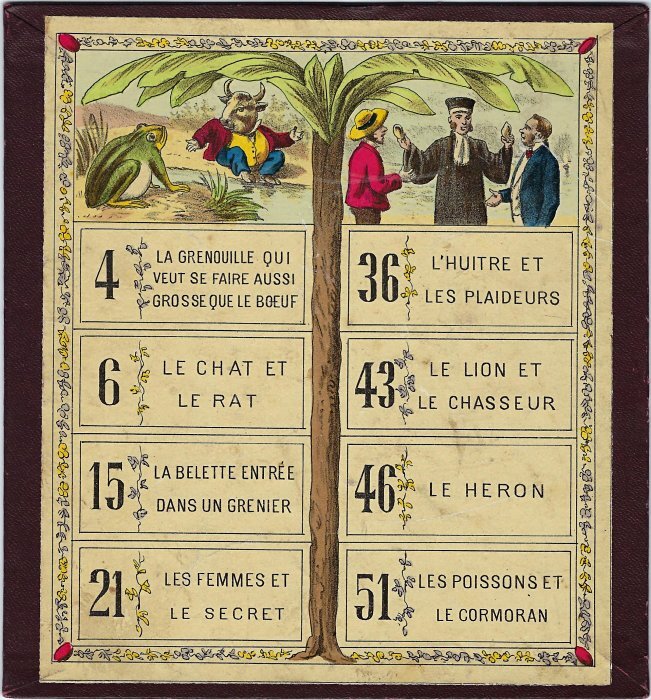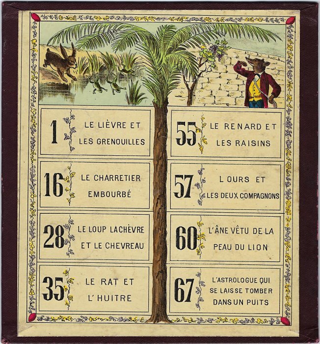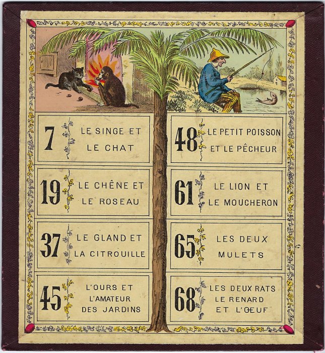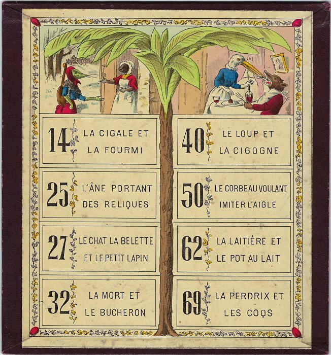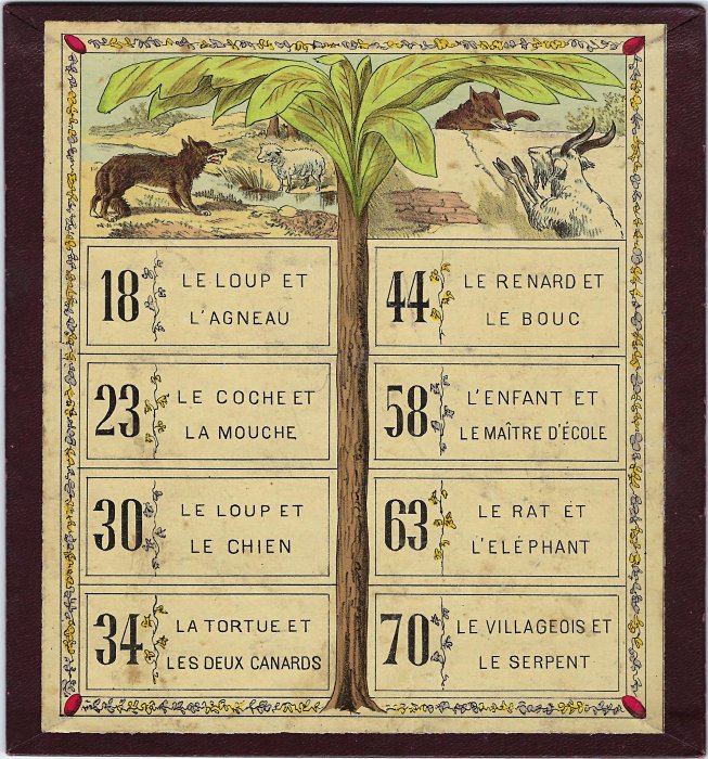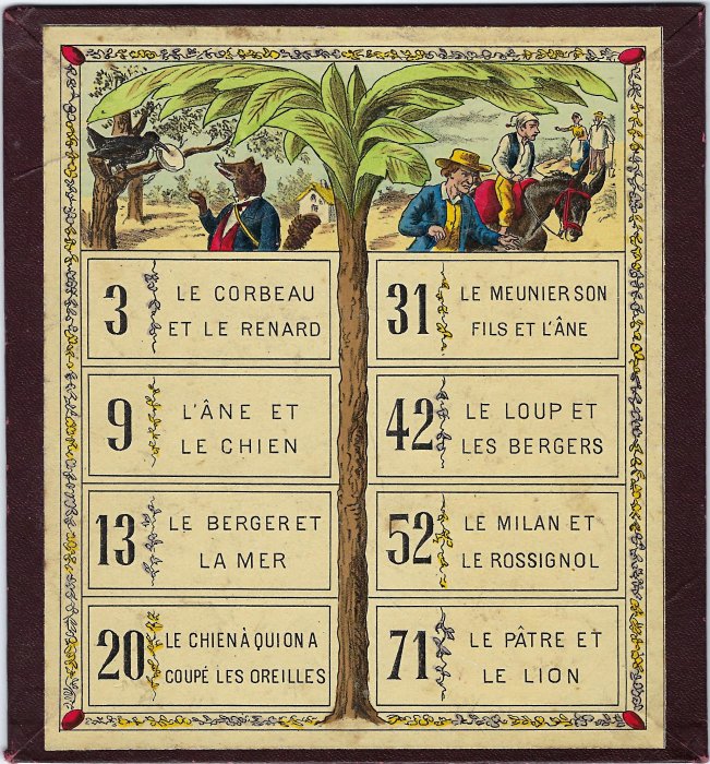 This is the most complete presentation of French La Fontaine Lotto games in our collection. The nine cards include each eight fable titles and lottery numbers, with two of them illustrated at the top of the card , with a palm tree separating and arching over them. The 72 "tokens" offer a fable moral with the mention of one or two points "won" or "lost."Apparently, each player received a number of the lovely cards. The paper tokens involve a quotation from the moral of a specific numbered fable, with a gain or loss of one to three points each. Were players challenged perhaps to guess the fable of origin for this short quotation? The instructions I received suggest that the appropriate card holder had only to read the title next to the number to receive the card – and then had to pay or collect. That part of the game remains mysterious to me. It seems likely that the player first to cover all eight of the numbers on one of his cards is the winner. - Date