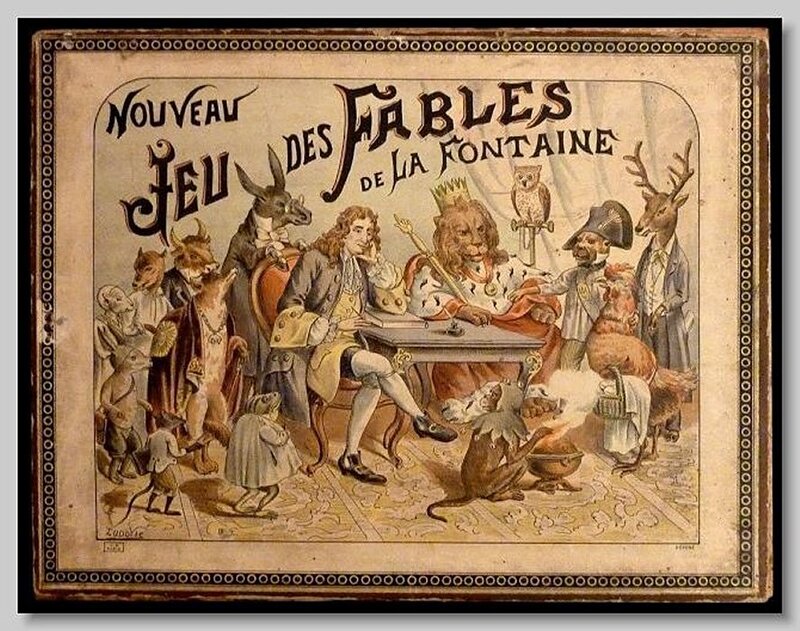 1895 "Le Jeu des Fables." (The game of fables.) Publisher Leon Saussine. Complete with 9 cards 7" x 7½" and 72 tokens. $216 in a French auction purchase mediated by Bertrand Cocq, August, 2020.