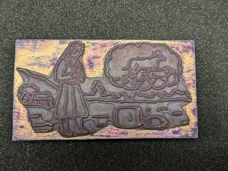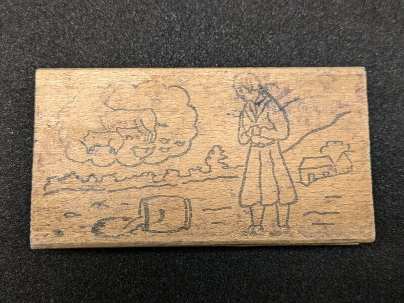 The rubber side of the stamp shows the image more clearly than the stamped version, worn perhaps from use. One can see clearly the chickens, pig, and cow that the milkmaid dreamed of along the way to the market. See also the "Thank You" stamp under "Household." - Date
