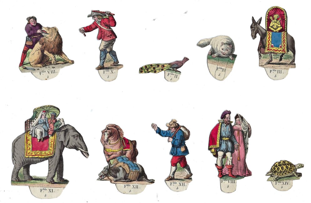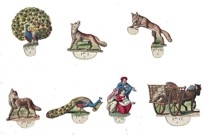 This set includes a small oblong booklet with fifteen of La Fontaine's fables and a concluding set of as many pictures. These latter give the pattern for use of a postcard-sized background-board with several small pocket-like openings for inserting figures--like the peacock and elephant here. There were originally some thirty-three figures, of which seventeen still remain in this set. Four of the scenes can still be reproduced entirely: 1, 2, 8, and 12. The figures are enclosed in a marbled envelope the same size as the booklet. There is a slip-case for the whole ensemble. My favorite private collector gives a date of 1820 and makes the publisher Alph. Giroux. - Date