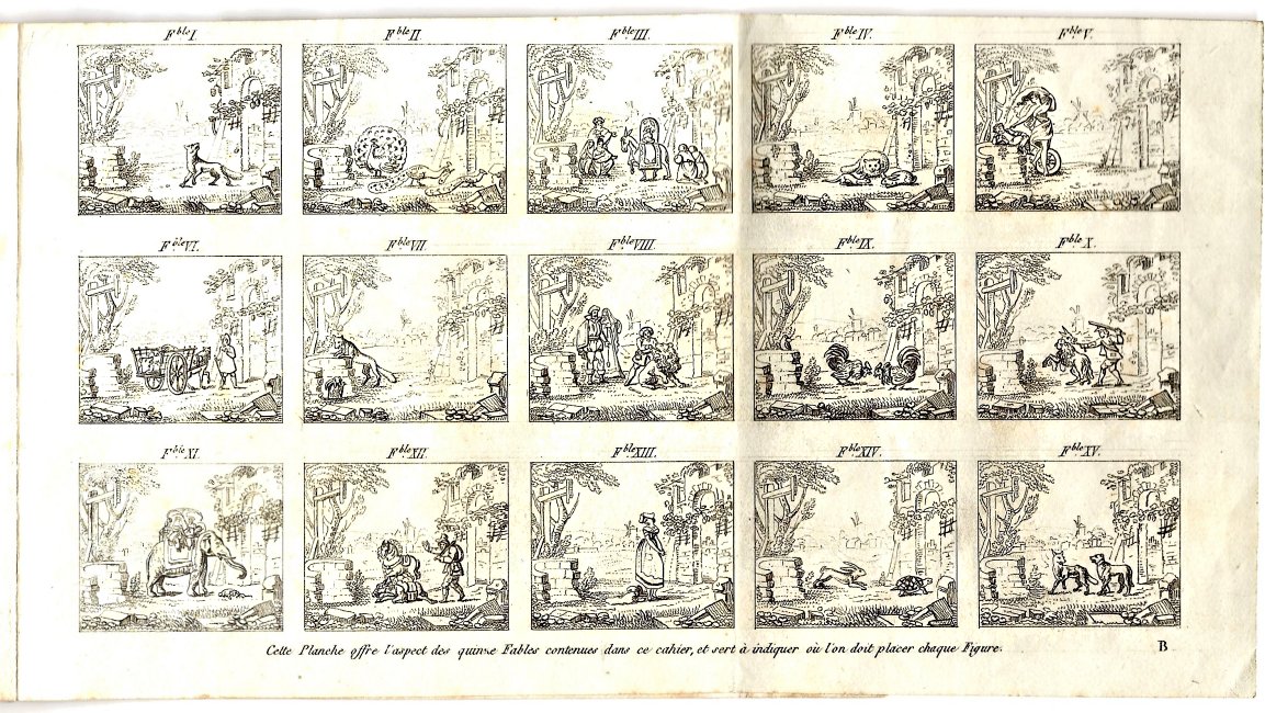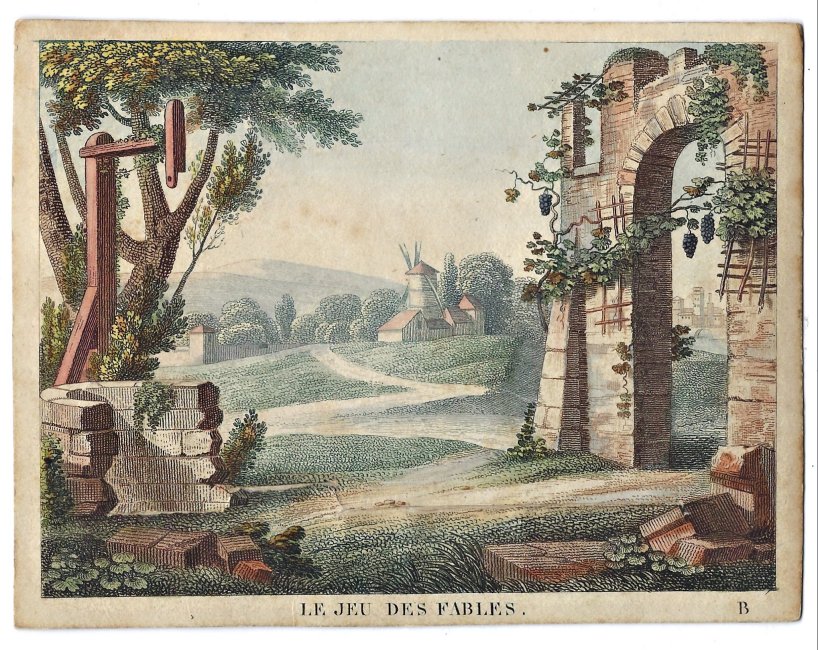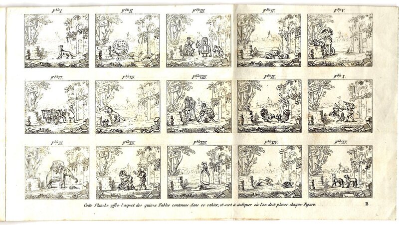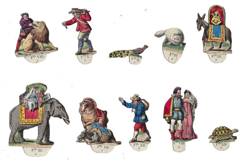1815? Le Jeu des fables, ou fables de LaFontaine mises en action. Avec figures coloriées et découpées, dessinées et gravées par Lambert ainé. Paris: Lambert. Received in trade from June Clinton, March, '93.
