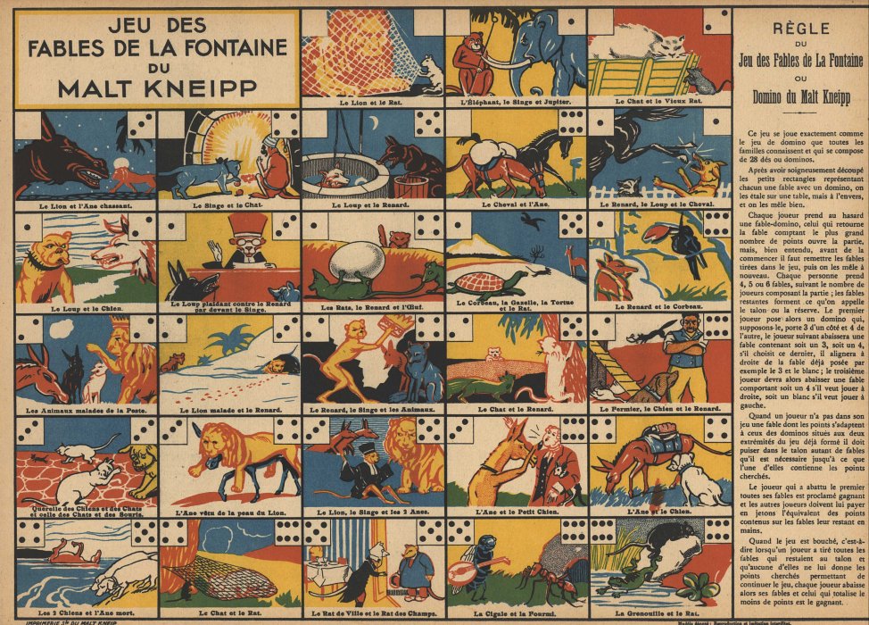 This light cardboard piece could have appeared here under "Advertisements," "Printed Material," or "Games." I chose the last of the three. The sheet includes instructions to cut out the 28 dominos, each of which pictures a well-known La Fontaine fable. The seller guessed a printing date between 1928 and 1940. It is curious that "Kneipp" is spelled with two p's at the end at the top of both parts of this sheet. The printer, however, is "Malt Kneip." - Date