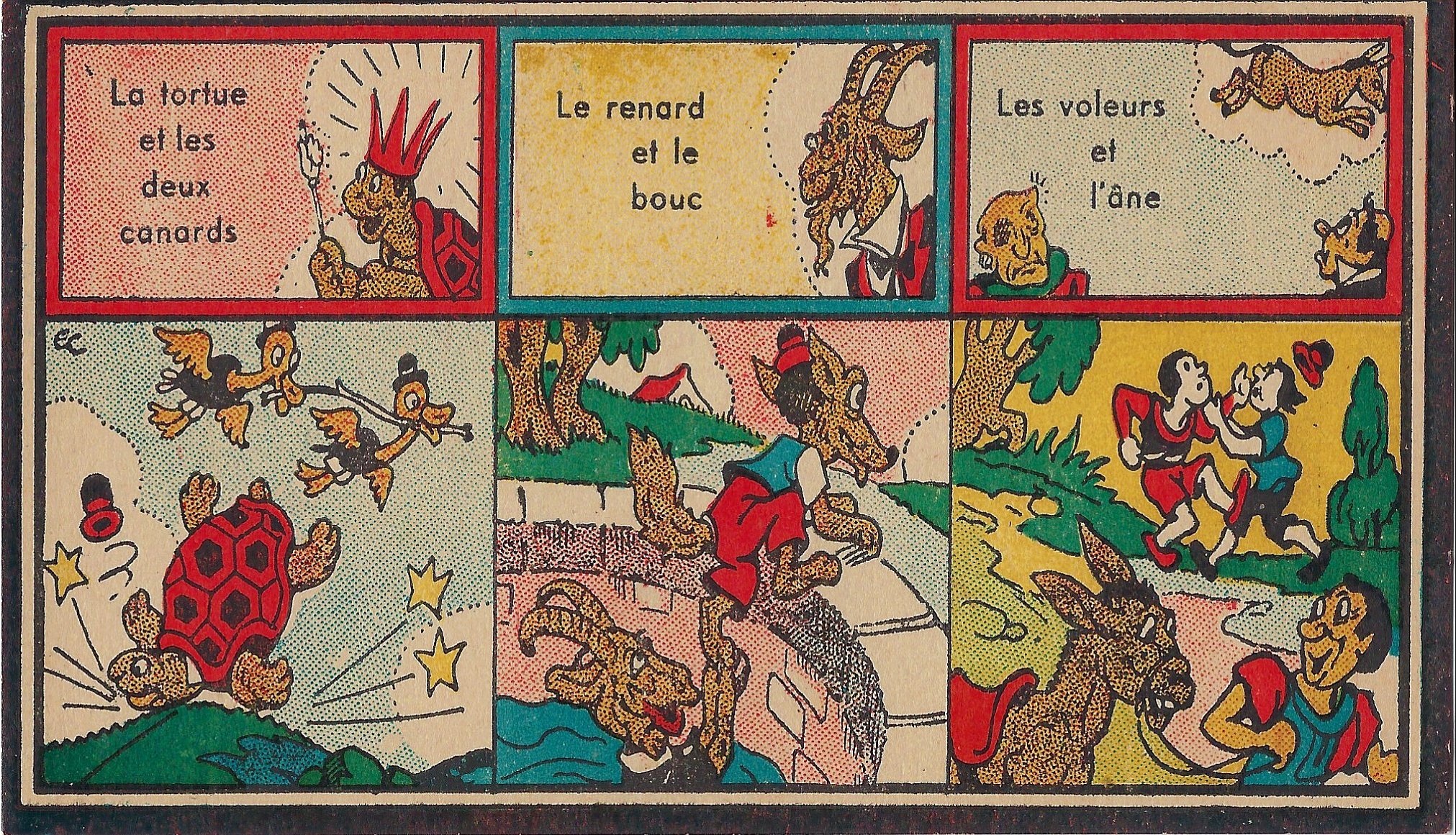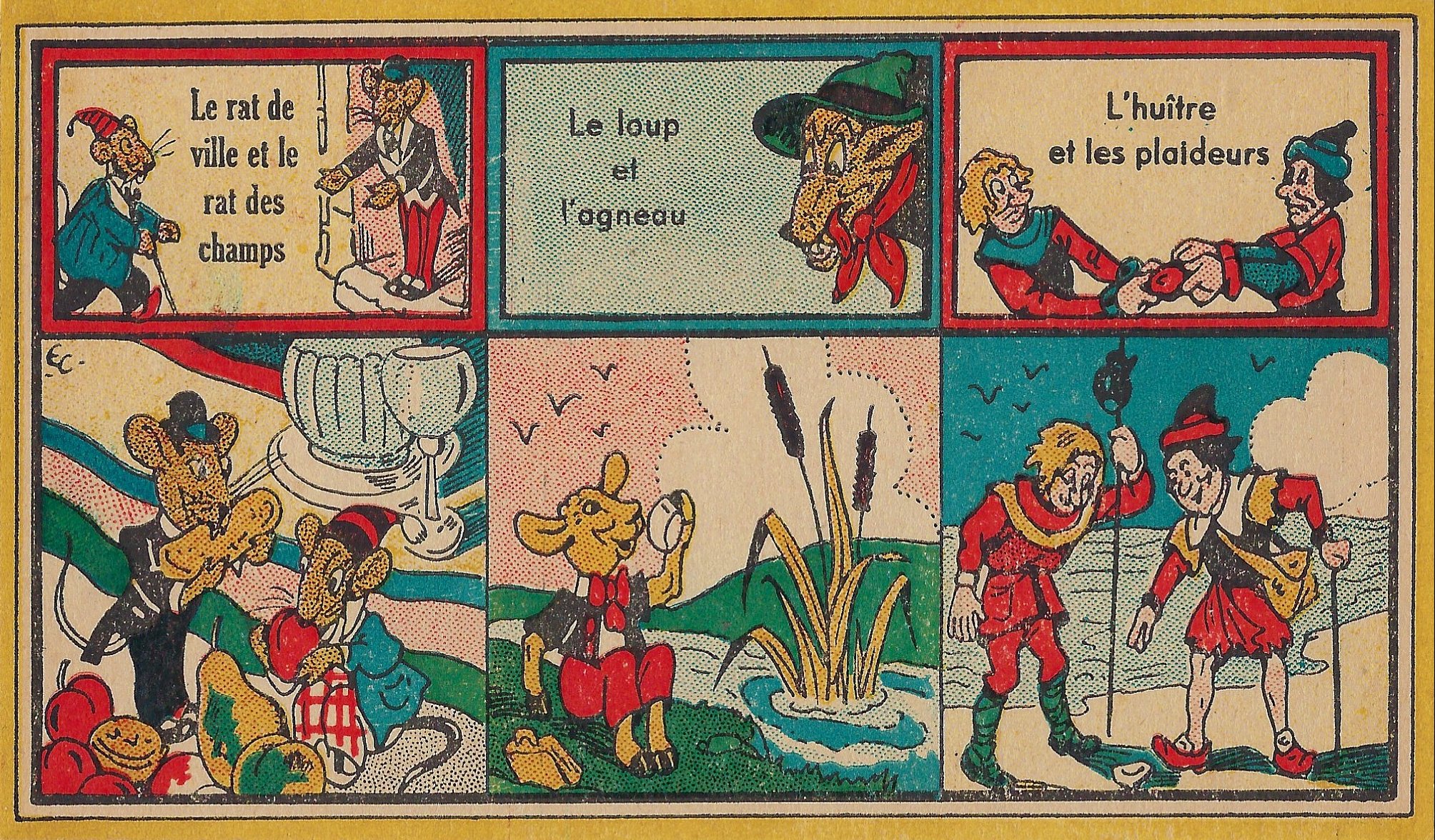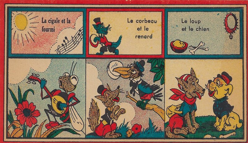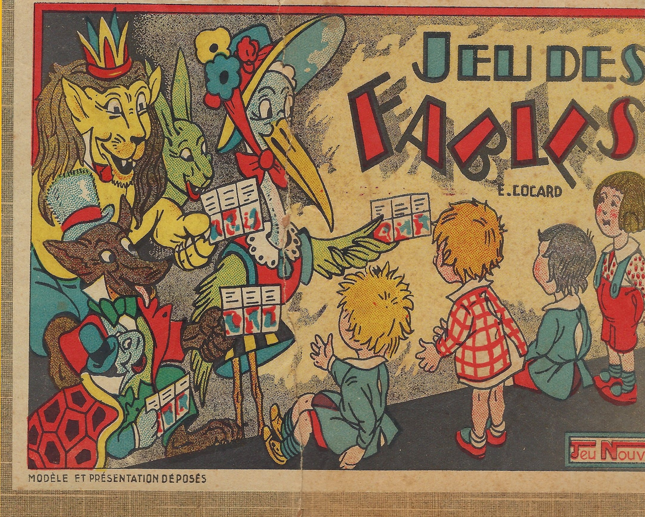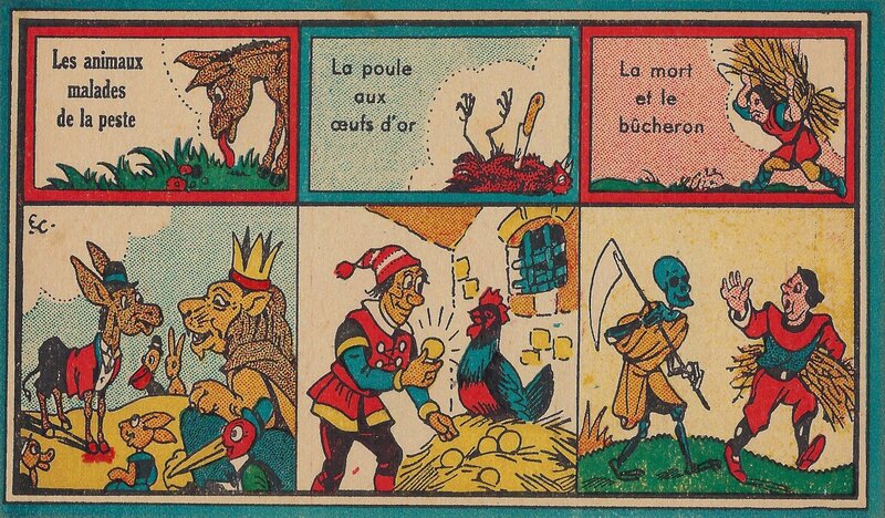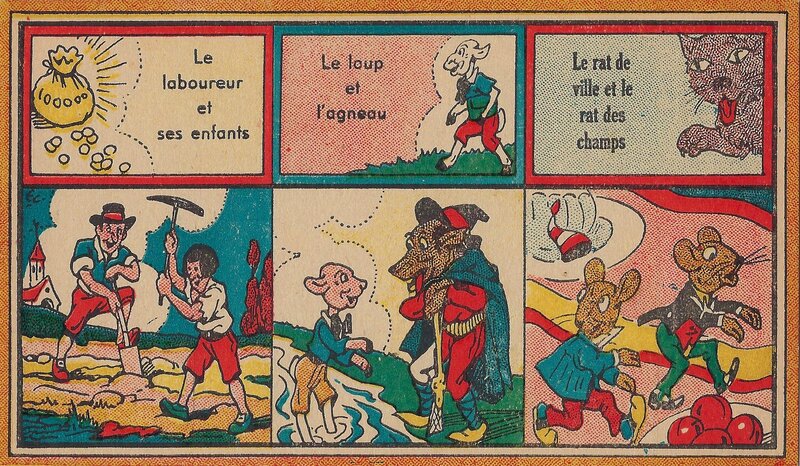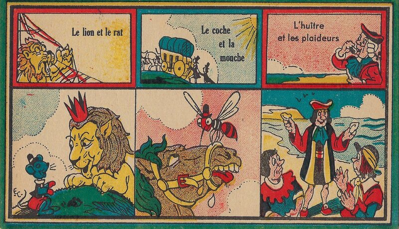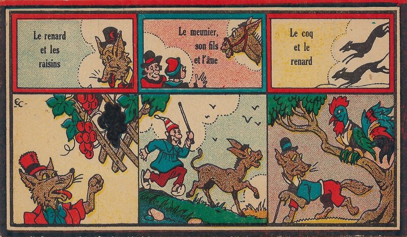 1930? Jeu des Fables. Jeu novo. 12 cards 6.75” x 3.8” each featuring three titles and a corresponding scene from the fable itself. Also a title-card with rules on the verso. Emmanuel Cocard. €40 from dienbienphu01 through Ebay, July, ‘25