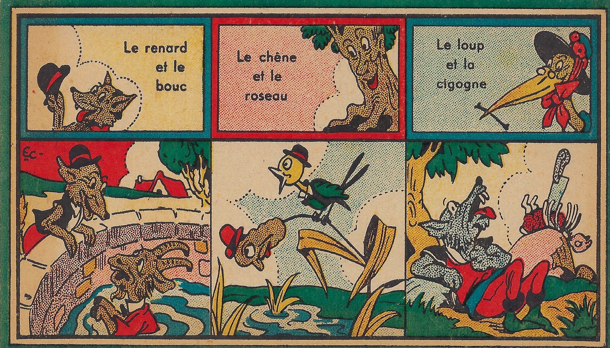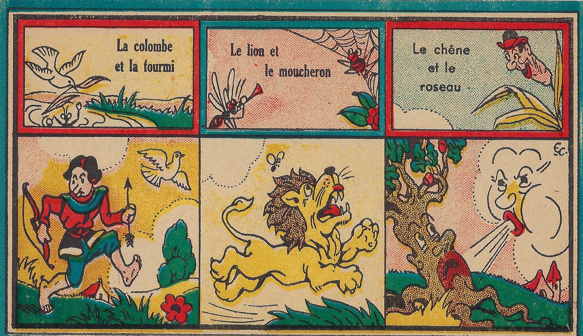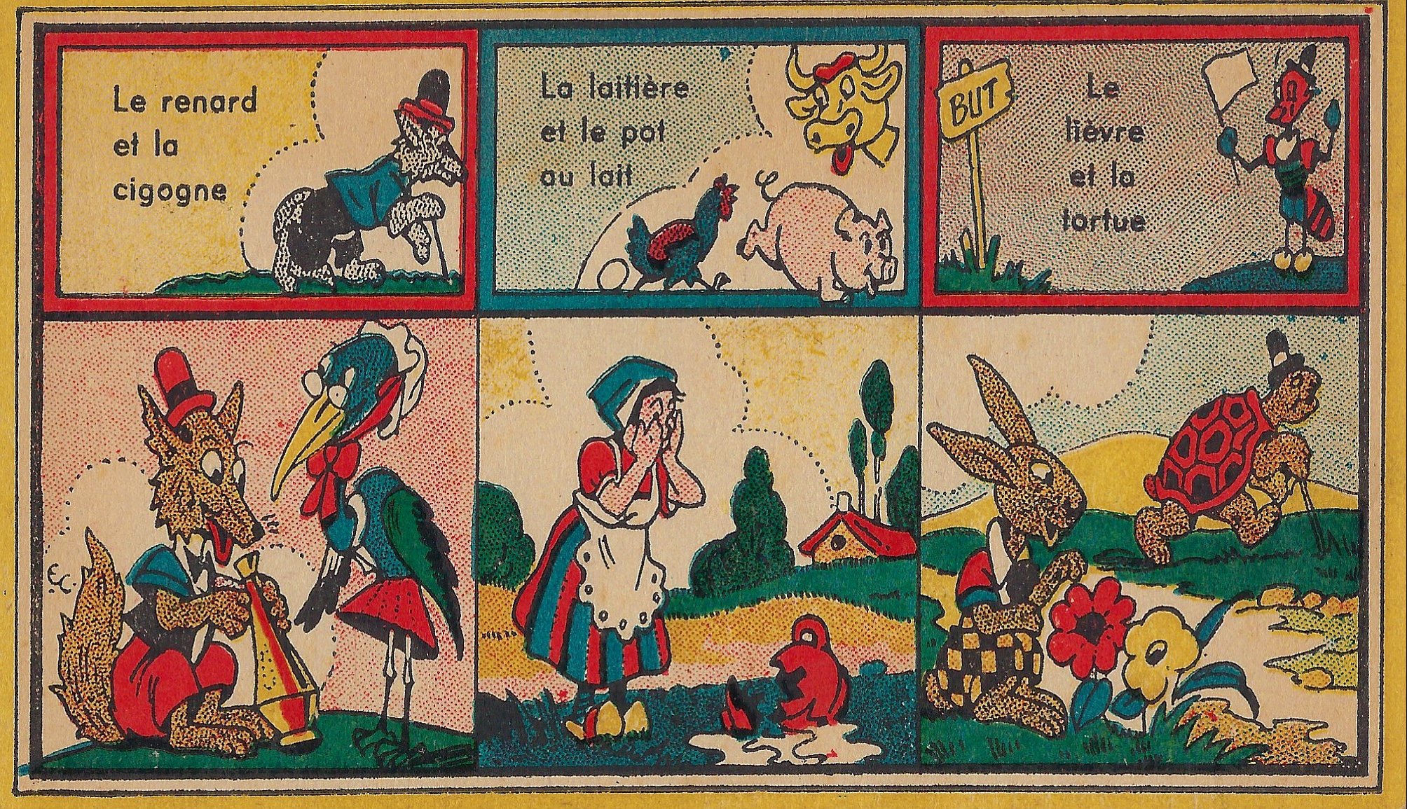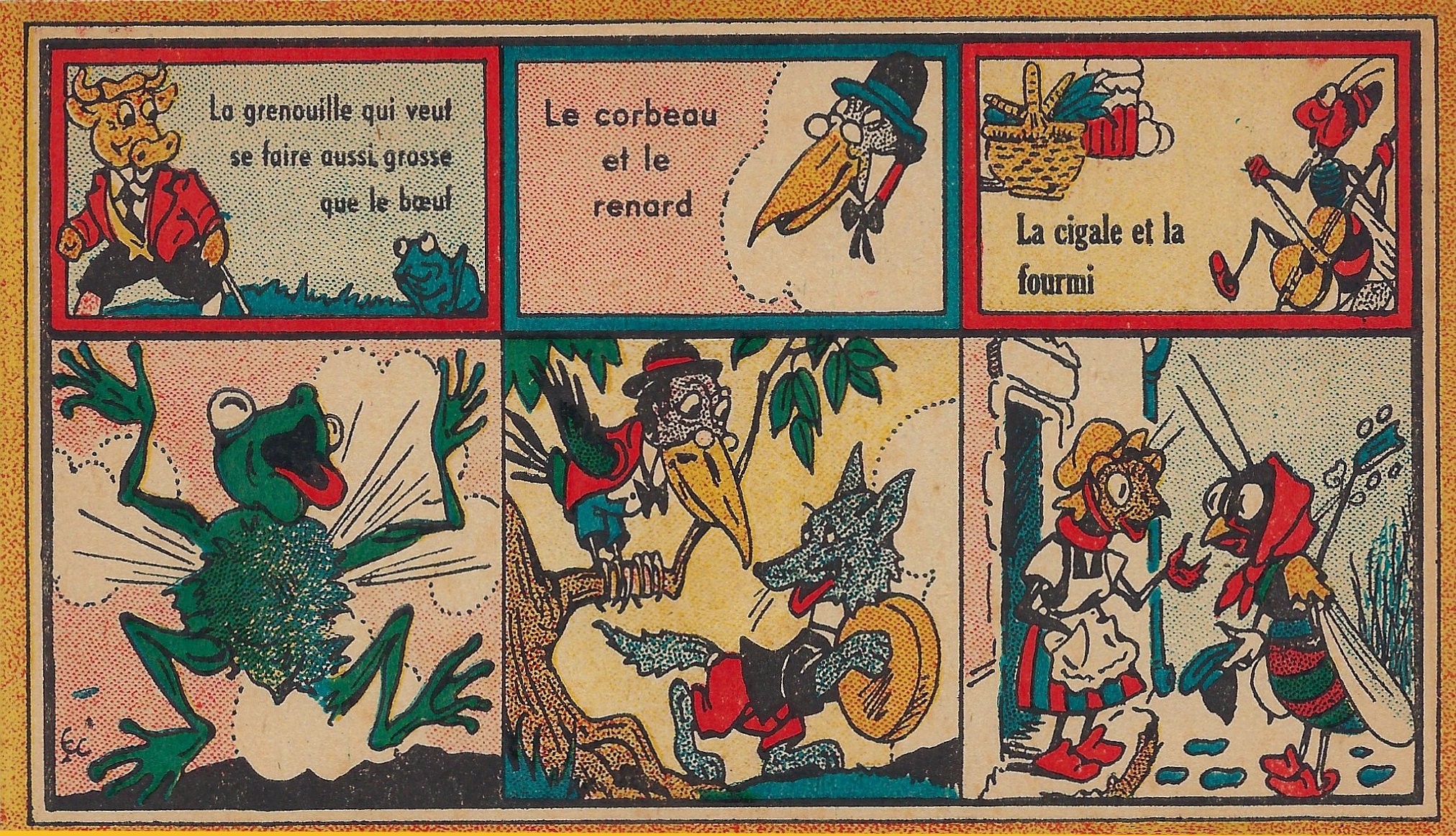 The title-card of this game played with two different sizes of cards is slightly cut on the right edge. Emmanuel Cocard is well known to our collection for his large paperbound pamphlets of La Fontaine. His lively colored work continues here. What we have is the title-card and twelve cards featuring each 3 fables through a title and a sample scene. Ten fables are given two images each. The image of the exploding frog in OF gives a good sense of the liveliness of these images! Other strong images are both for OR; both for “Fox and Goat”; and WC. The title-card speaks of smaller cards with verses, which have apparently been lost. - Date