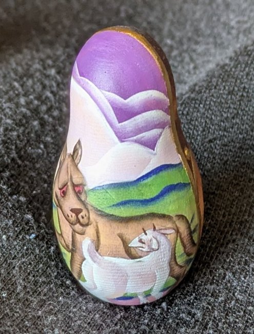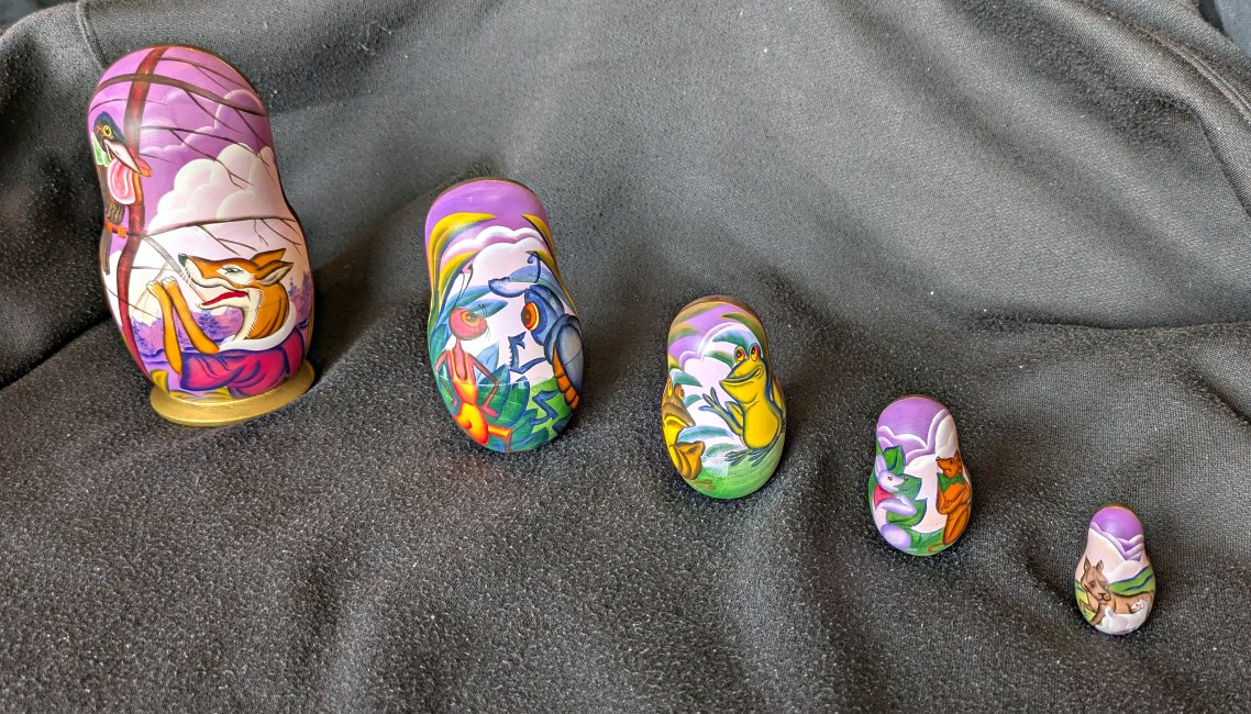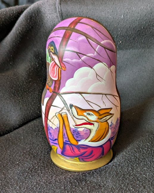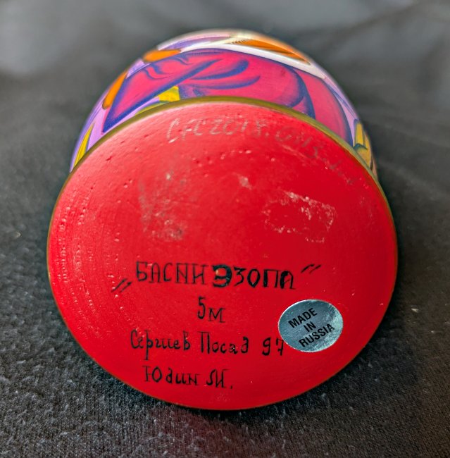 1997? Russian matryoshka set of 5 dolls Aesop’s Fables.” 5.75” high. Signed perhaps “Aesop’s Fables. 5 Pieces. Sergiev Possa 97. M. Yudin.” Unknown source.