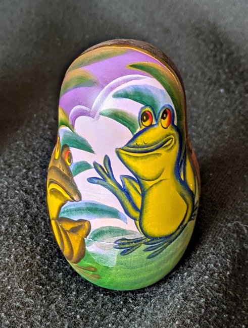 This is another lovely signed Russian matryoshka. The rear halves are uniformly two-tone brown with decorative lines. The coloring is strong, with emphasis on purple. The five pieces, in order, picture FC; GA; “Two Frogs”; TMCM; and WL. A quick look online could find no second copy, though it brought up many other representations of FC. - Date