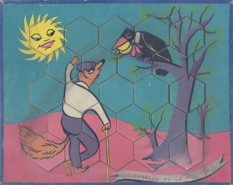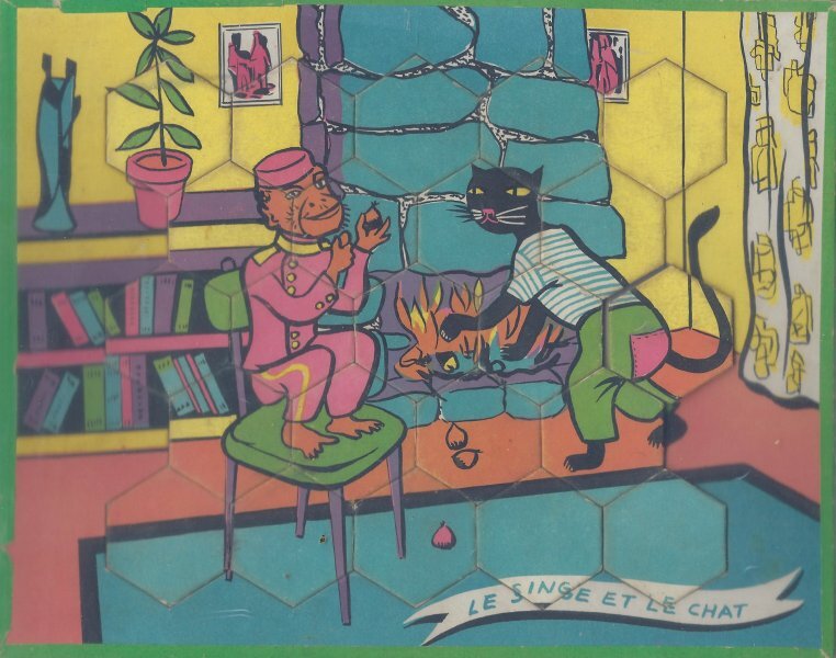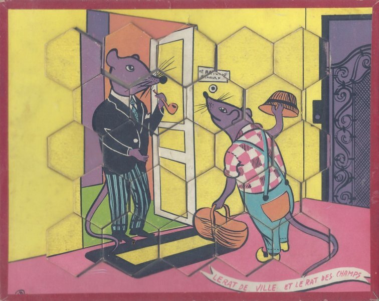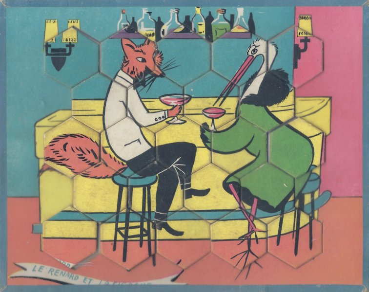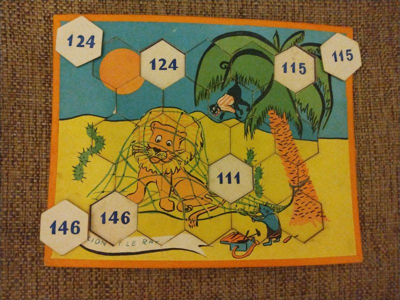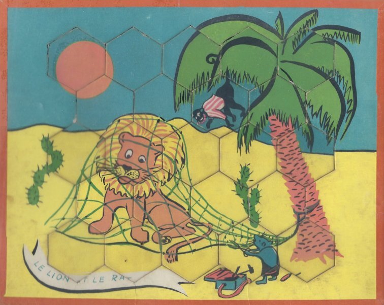 Here is a different approach to fable puzzles. Each fable image has a frame with room inside for 23 hexagonal pieces, each numbered on its verso. All except TMCM have a matching image that can help to solve the puzzle. I am surprised by the good condition of these puzzles. The pieces still fit! FS has a surprising but consistent misalignment. Other puzzles are FS, CP, and "The Monkey and the Cat." - Date
