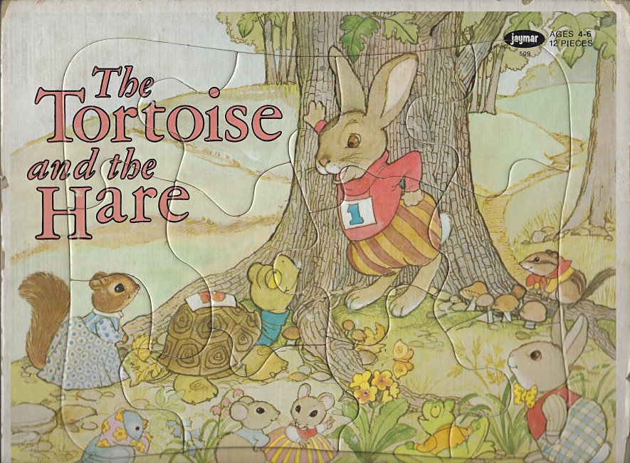 1972? Jaymar Tortoise and Hare Puzzle. Ages 4-6. 12 pieces. Copyright Drawing Board Greeting Cards. Jaymar Specialty Company, Brooklyn, NY. $11.99 from glass-eye-industries through Ebay, May, '19.