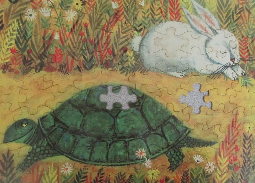 I needed to see how many pieces were missing, so I did the puzzle myself. The artist seems to be "Aliki." And now I wonder: Are there more fable puzzles in this series? And now, one day later, I have found one of the two missing pieces! Maybe I'll still find the other one! - Date