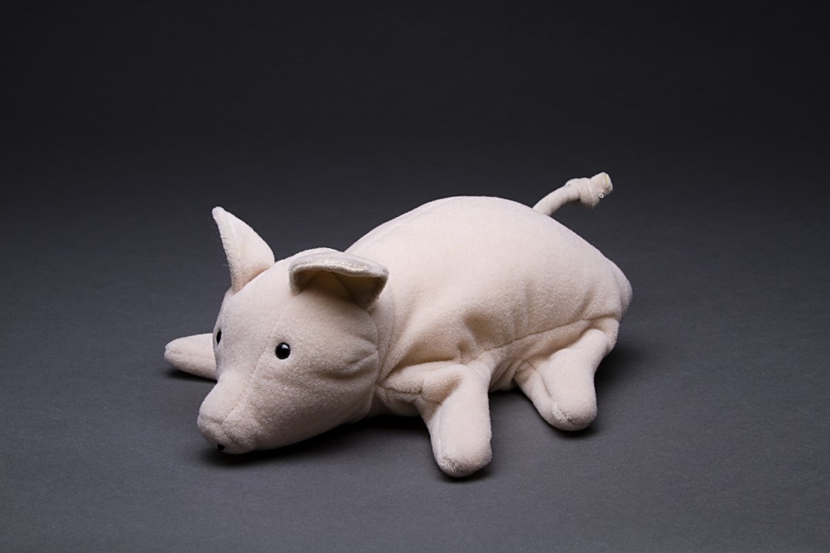The tale on the card attached to this puppet tells of the pig who happened among sheep and was upbraided for all his squealing when the shepherd caught him. The pig answers the sheep: “He nly wants you for your wool, but he wants me for bacon.” A clever manipulator can get fingers into all four legs and the face. - Date