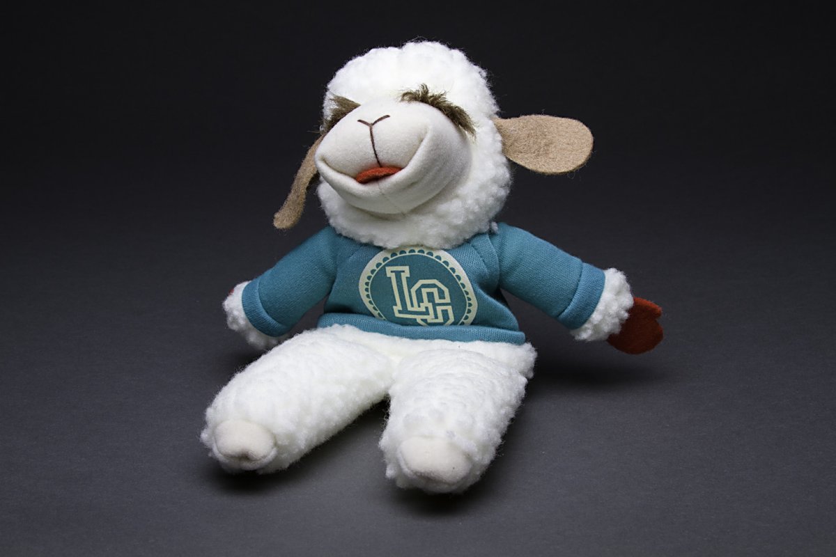 It takes a very small hand to get inside this puppet. Once in, a puppeteer can get a finger or two into Lambchop’s face. Lambchop wears a sweatshirt with “LC” circled. - Date