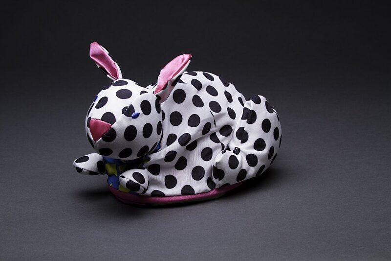 A firm oval helps define the two characters. The hare has blue eyes, pink ears and nose, mostly black and white polka dot fur, and a kind of bib of yellow stars on a blue background. His four paws extend out from his body. The tortoise is mostly green, with two strong patterns on his, one of them a checkerboard. - Date