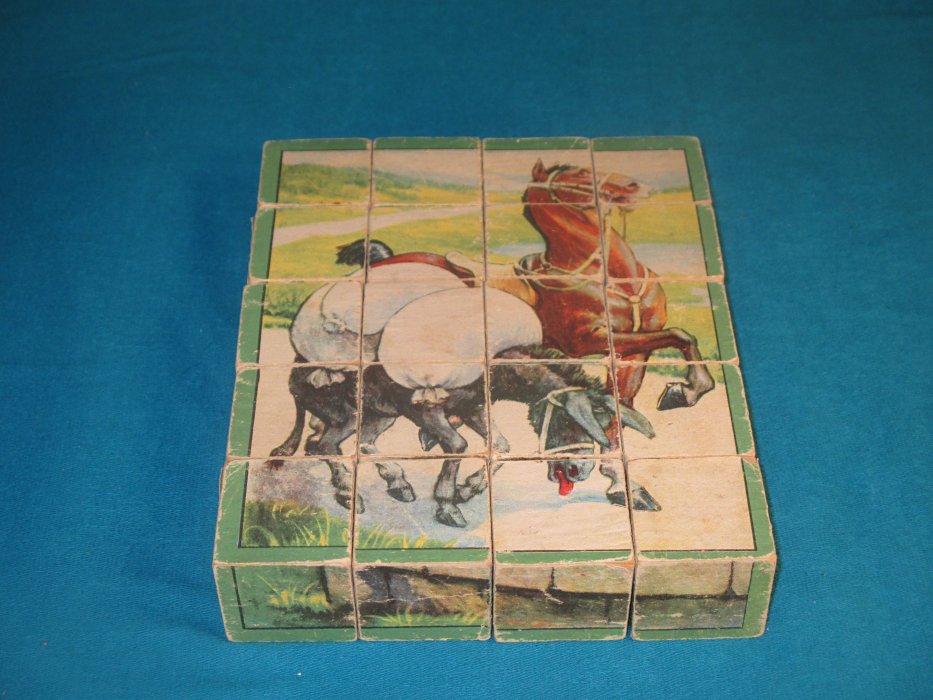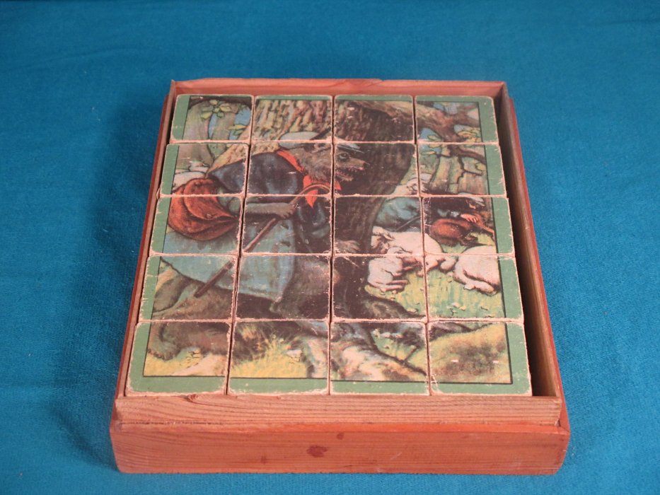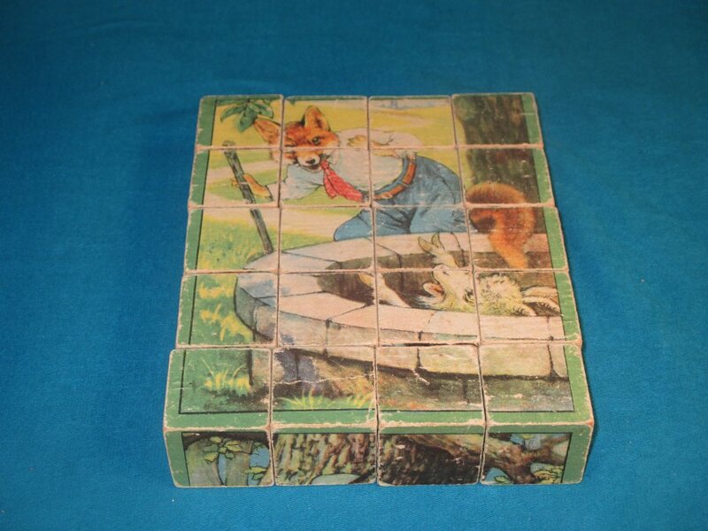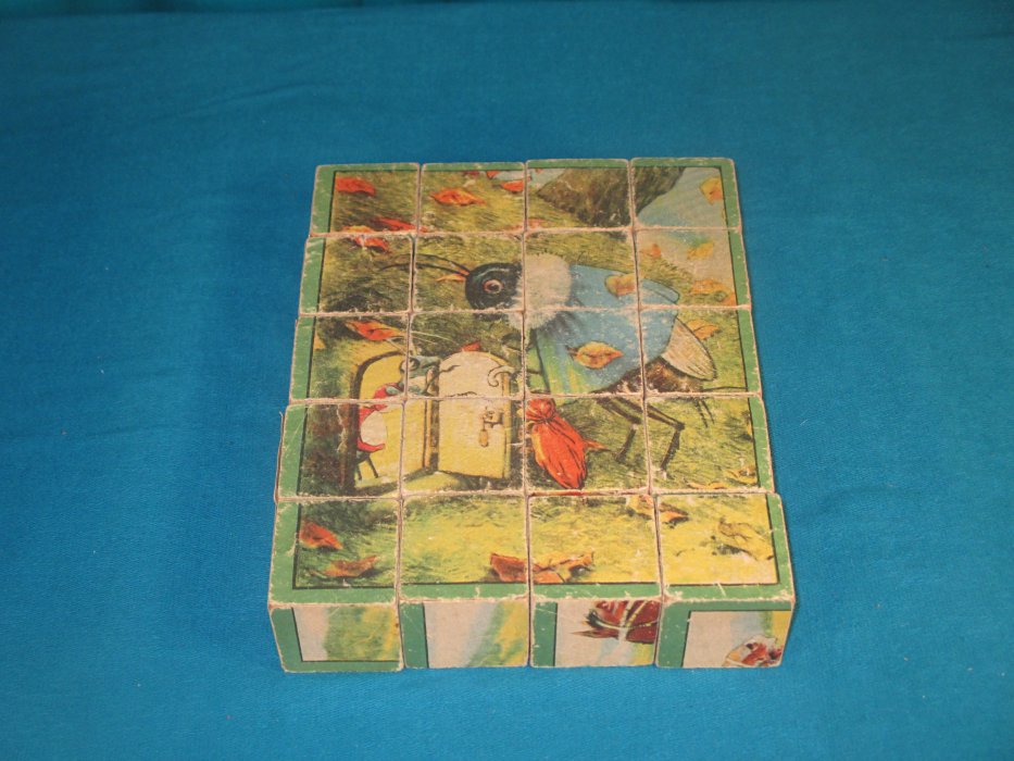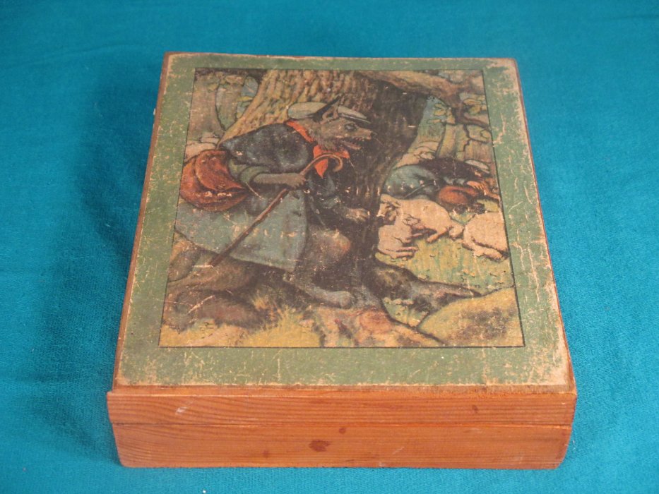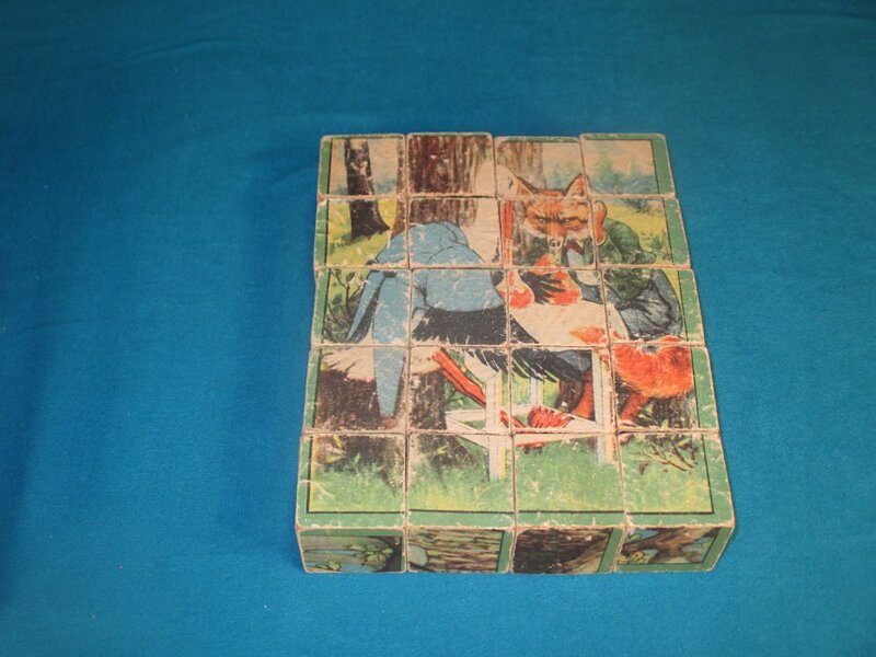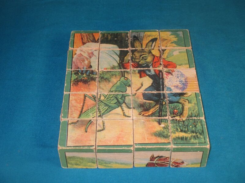 1920? Set of 20 six-sided picture cubes illustrating fables. Slightly larger than 1½" on each cube's side. In the original box? "Wolf in Shepherd's Clothing"; "Horse and Mule"; "The Fox and the Goat"; GA, FS; and an image involving a grasshopper and a rabbit. $34.36 from vali51000 through Ebay, July, '20.
