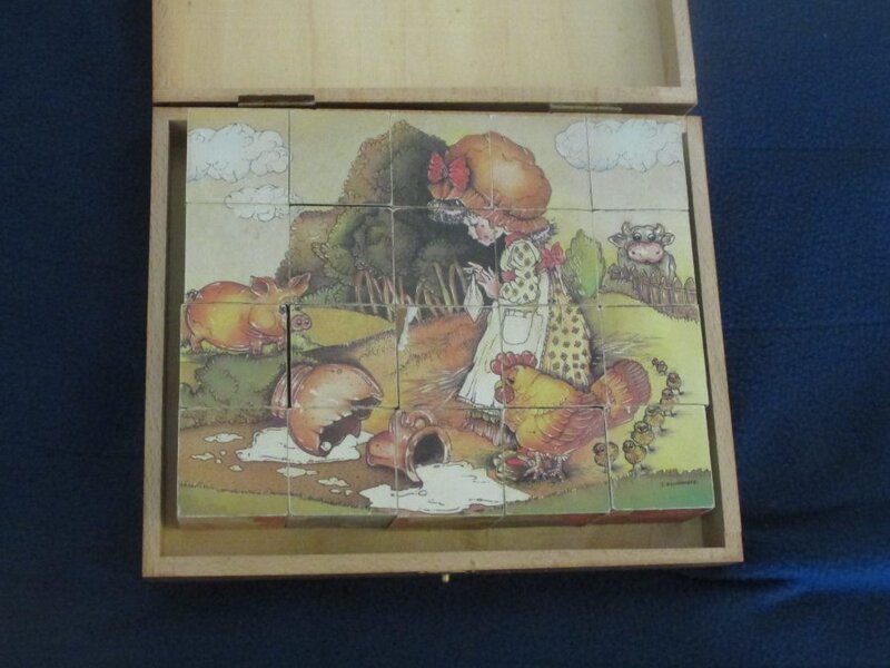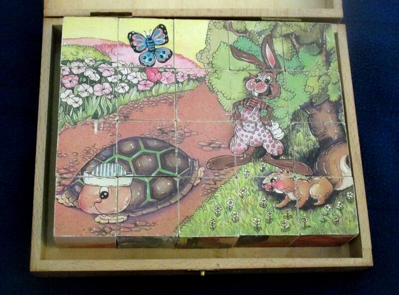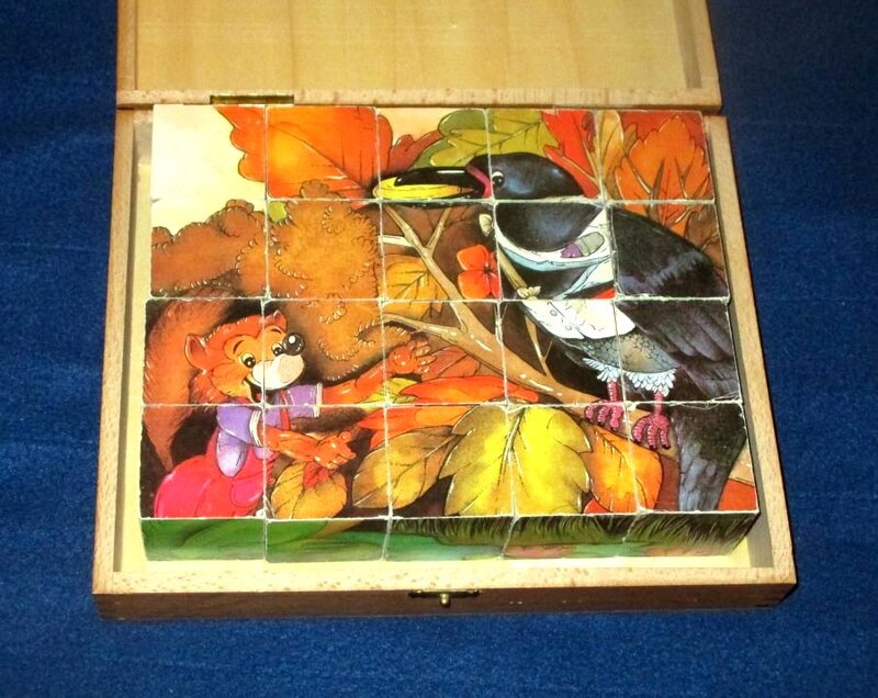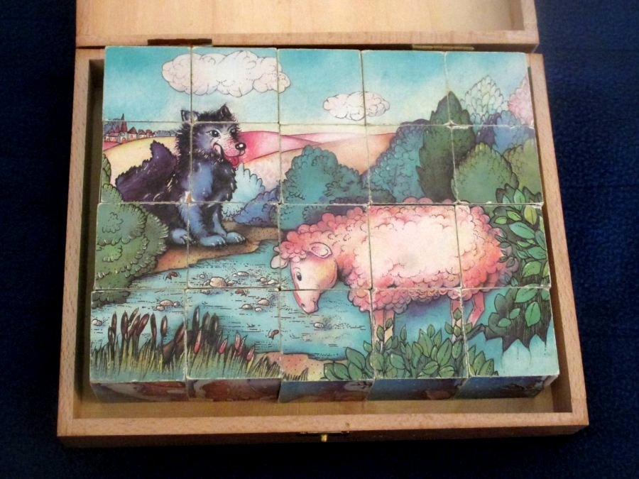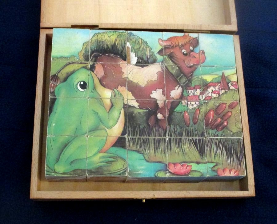 1950? Set of 20 six-sided picture cubes illustrating fables. Jeujura. Slightly larger than 1½" on each cube's side. TH; GA; WL; OF; MM; and FC. In the original box. €9.99 from ptitoys2008 through Ebay, June, '21.