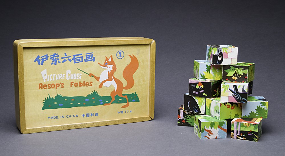 1980? Chinese story-blocks #1, including FS, "The Deer with Beautiful Antlers," CP, DS, TH, FC. The collection has four exemplars of this version of picture cubes. One found in a small-town Minnesota toy shop with Linda Clader. Another for $8.95 from Sandi Shaw, Concord, CA, through Ebay, Jan., '03. The third for $5.50 from Timmy Sisung through Ebay, April, '04. The last from T. Stanford, Neptune Beach, FL, through Ebay, Dec., '12.