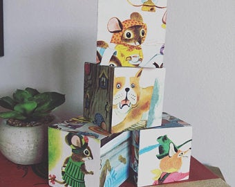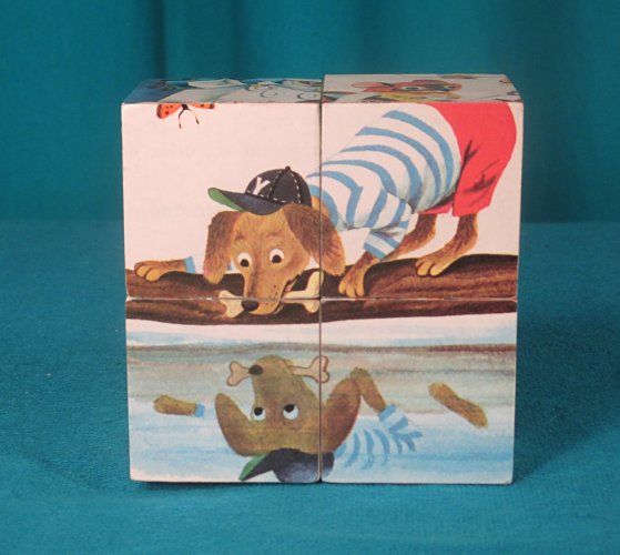 2020 Aesop's Fables wood game: Little Golden Books. $36.38 from Little Vintage Tale, Madison, CT, through Etsy, July, '20. Images taken from "The Country Mouse and the City Mouse and Other Aesop's Fables" by Patricia Scarry. Four six-sided story blocks, each about 2" on a side.